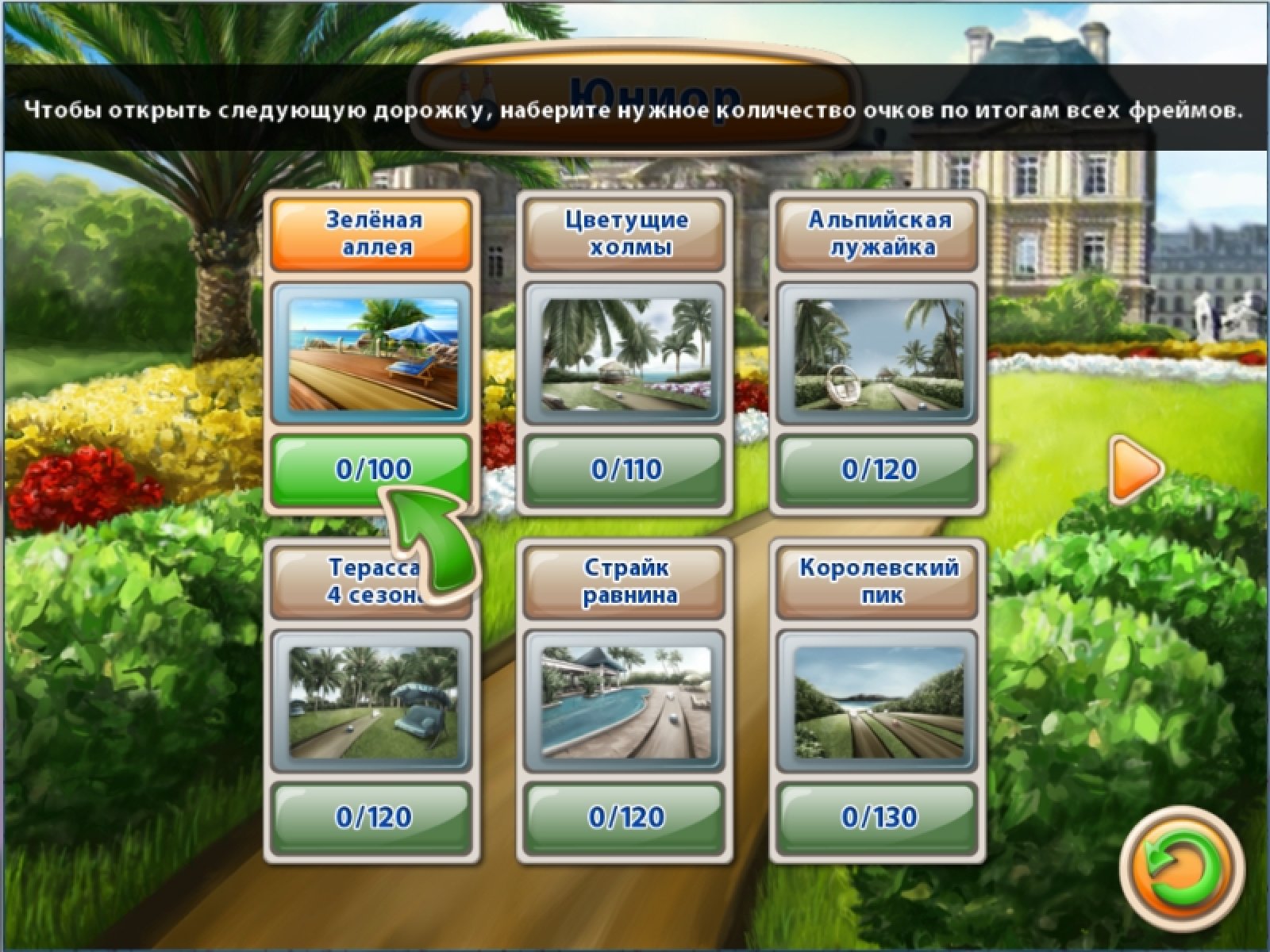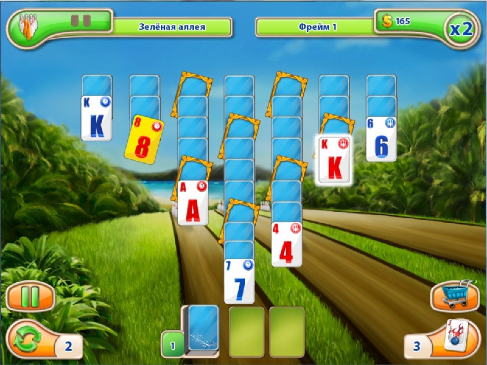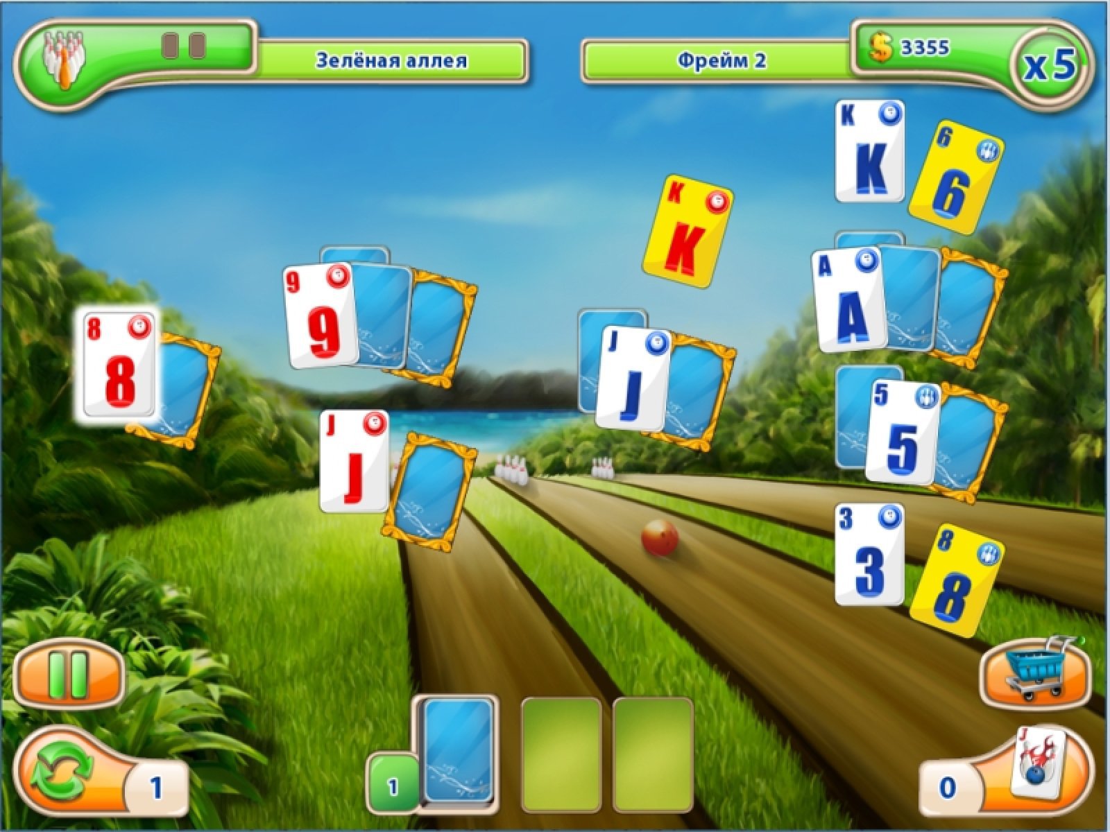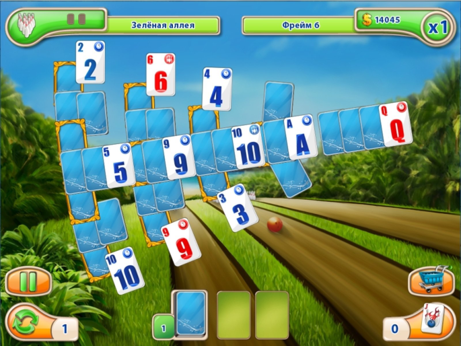 Уникальные боулинг-отели приглашают новых гостей! Чудный отдых и спортивные состязания на свежем воздухе к вашим услугам. В игре 12 дрожек по 10 уровней, каждый из которых символизирует один фрейм, как в боулинге. Уровень же представляет из себя карточную раскладку-пасьянс. Снимайте карты попарно и реализуйте цели уровня. Главная задача - снять 10 специальных карт-кеглей. За снятие каждой карты начисляются деньги, а сумма зависит от типов снятых карт и от множителя. По итогам каждого завершённого уровня начисляются очки . На их основе рассчитывается количество баллов за весь фрейм. В полной версии игры доступно 120 уровней «Страйк солитера»!!!