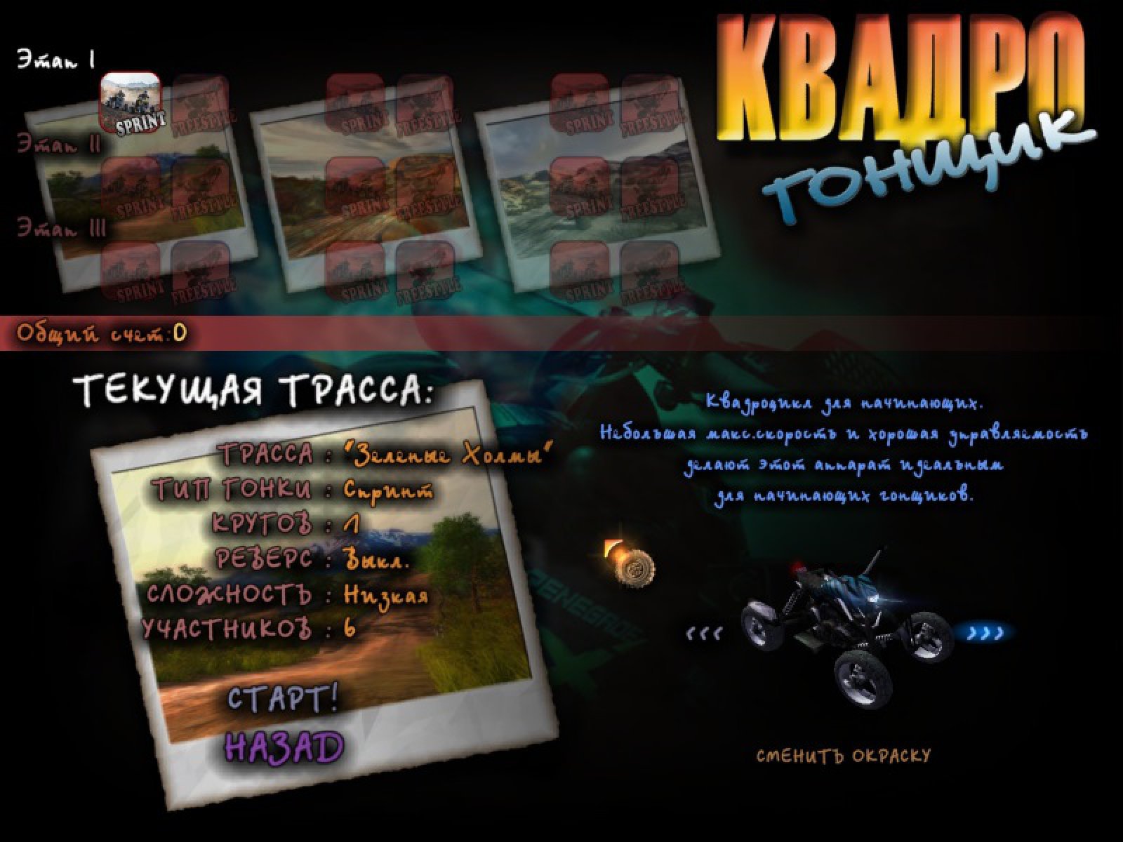 Примите участие в настоящих гонках на квадроциклах по самых извилистым и опасным трассам! Смелые и опытные соперники, гонки на невероятной скорости и полное ощущения присутствия в игре! Особенности игры: Отличная 3D графика на самом современном уровне Реалистичная физика Тематическое звуковое оформление