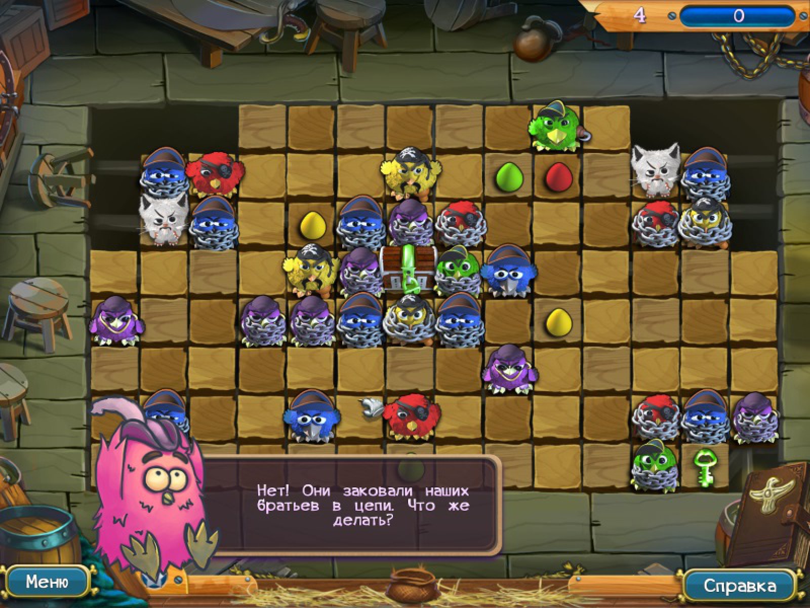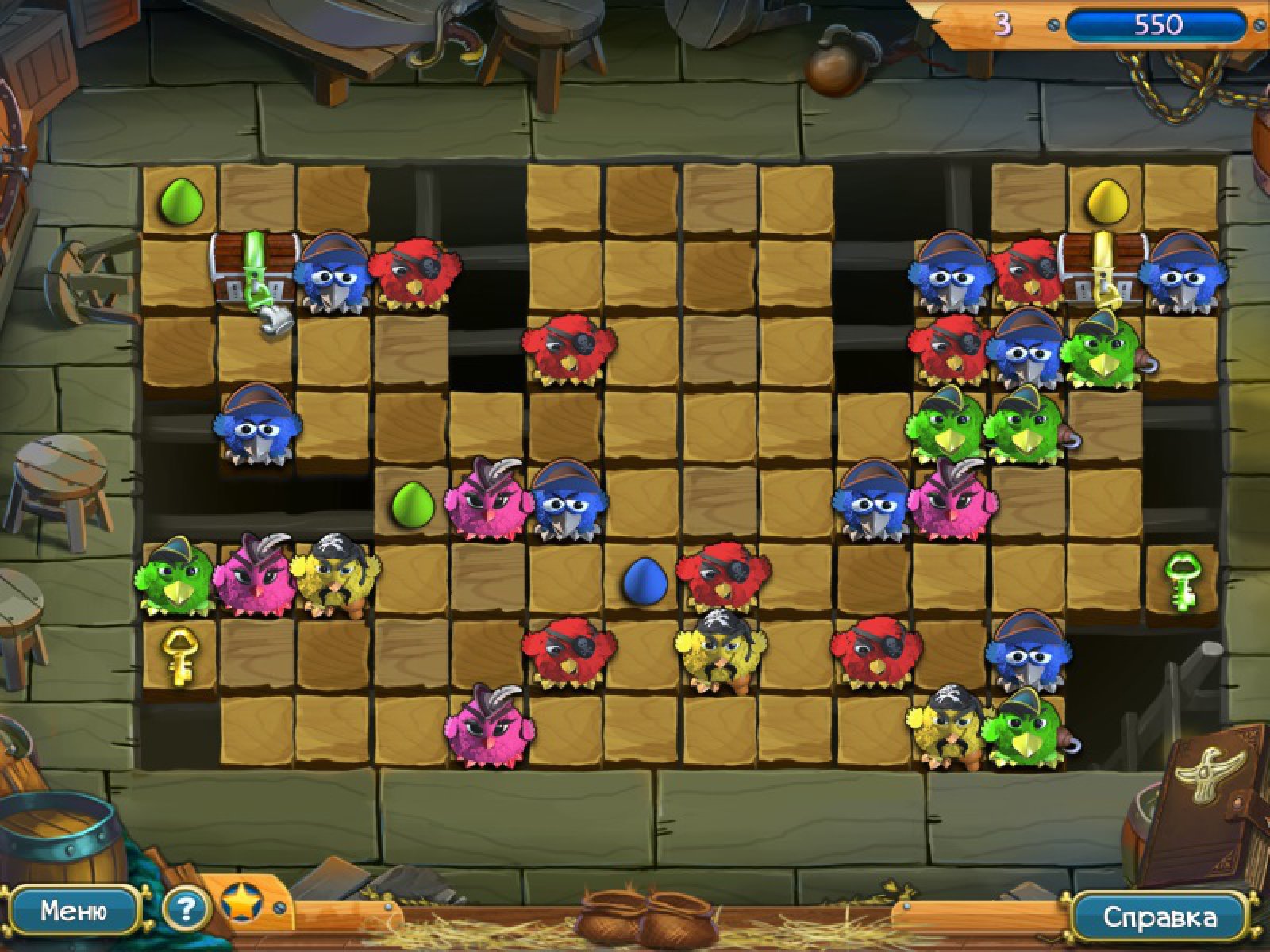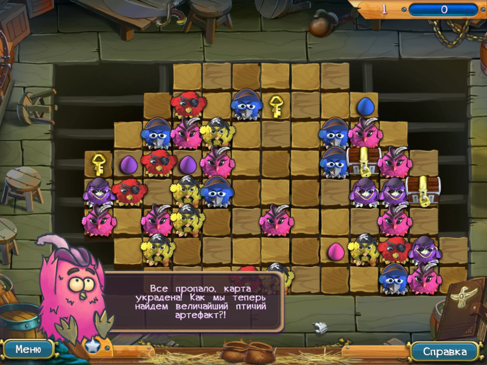 Дружная семейка птиц-пиратов обнаружила древнюю карту, на которой обозначено местонахождение легендарного артефакта. Птички даже уже собрались отправиться в веселое путешествие, но ночью к ним пробрался их заклятый враг - кот и похитил карту! Вам предстоит помочь вашим новым друзьям вернуть пропажу и добраться до заветного клада! Чтобы вернуть карту, птицам нужно составлять стаи не менее чем из трех особей и открыть все сундуки на игровом поле. За выполнение дополнительных заданий Вы можете получить золотые звезды, поэтому не торопитесь закончить уровень и покажите, на что вы способны! Отличная музыка, прикольная графика и веселые задания создают ощущение настоящего захватывающего приключения!