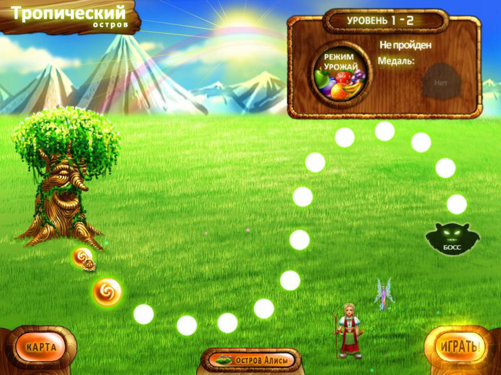 В жизни простой служанки Алисы вдруг возникает настоящая волшебная фея с отчаянной просьбой спасти их мир и защитить его от злой колдуньи. Сады в мире фей опустошены и не растёт там больше сочных фруктов. Алиса должна обязательно помочь! В награду же феи дарят девушке целый остров, украсить и обустроить который она может на свой лад и вкус. Более 100 уровней ждёт вас в этой игре «три-в-ряд», по результатам которых вы набираете очки. Их вы можете потратить на обустройство своего острова, выбрав замок, его отделку, элементы декора для территории и многое другое. Помогите Алисе справиться с этой задачей и построить королевство своей мечты. Пройдите вместе с ней множество красочных и забавных мини-игр.