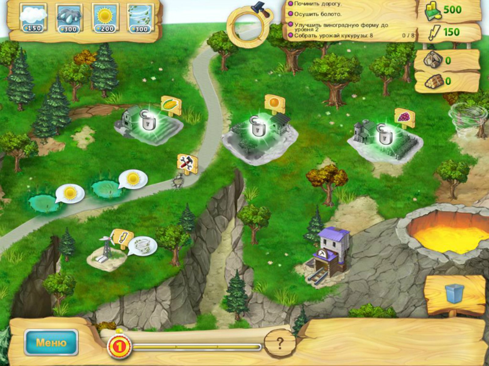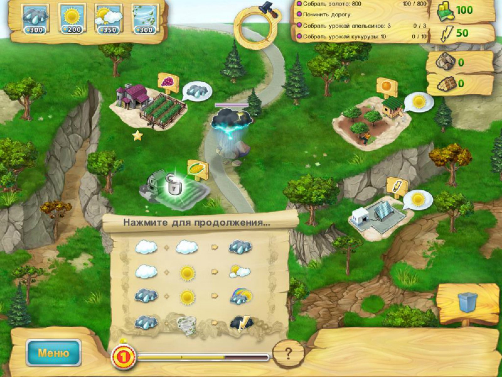 Нет фермера, не мечтающего уметь управлять погодой. Заказать дождь или солнышко, тенёк от облака или ураган — звучит не реалистично, но стало вполне реальным! Именно в этих идеальных условиях вам предстоит выращивать кукурузу и разводить виноградники, осушать болота и добывать электроэнергию на своей станции. Не обольщайтесь кажущейся простотой задачи — задачи каждого уровня усложняются и огород растёт. Нужно поспевать создать своим полям необходимые погодные условия, вовремя закупить или продать солнце, ветер, облака в метеорологической лавке. Порой на фермах даже возникают пожары, требующие незамедлительного вмешательства. Успешное прохождение каждого уровня будет отмечено специальными наградами. А пока развивайте свои фермерские умения с полной версией игры и оттачивайте мастерство управления стихией, чтобы завоевать репутацию настоящего повелителя.
