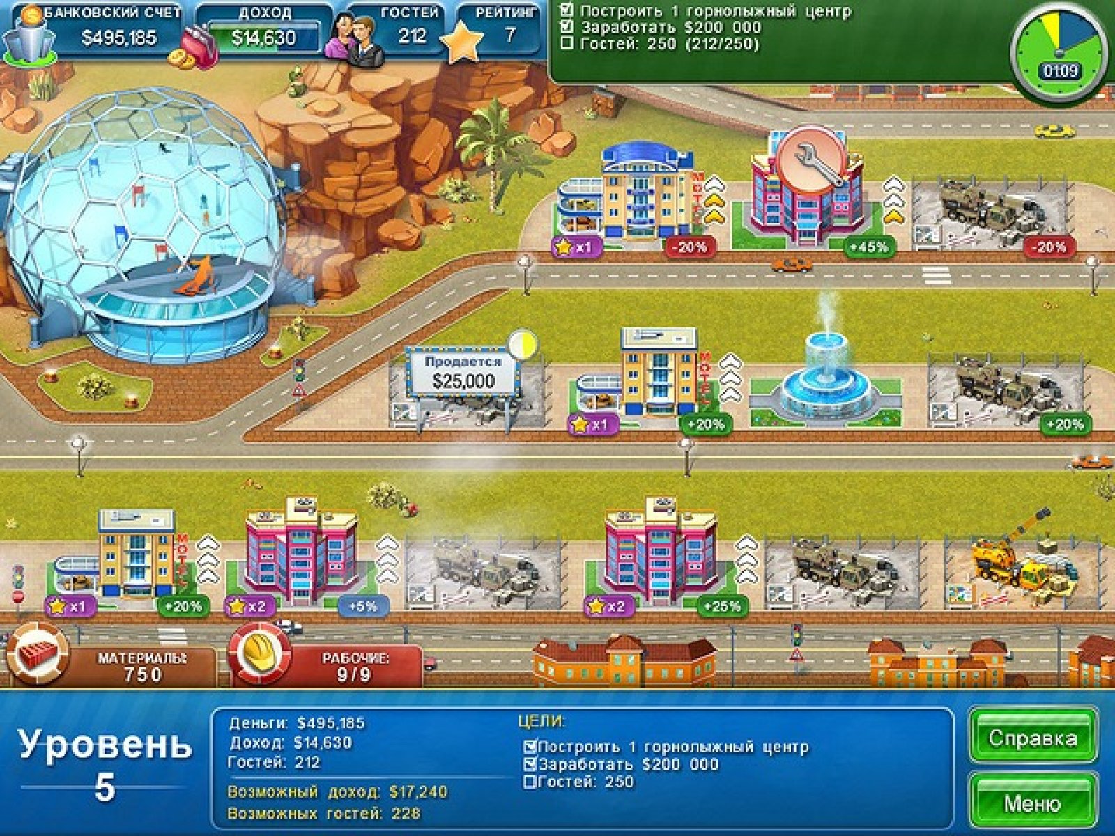 Так случилось, что в очередном эпизоде этой захватывающей бизнес-игры вашу кандидатуру утвердили на пост главы филиала строительной компании. Вы уже прочувствовали весь груз этой приятной ответственности? Тогда беритесь скорей за работу и начинайте потихоньку скупать участки под строительство роскошных отелей. Чтобы деньги незамедлительно начали поступать на ваш счет, постарайтесь максимально быстро построить первоклассные гостиницы и привлечь как можно больше клиентов. От уровня к уровню вам будут открываться новые возможности и станут доступны разные интересные фишки, которые обязательно понравятся любопытным туристам. Вовремя закупайте необходимые стройматериалы, нанимайте рабочих и делайте ремонт в тех отелях, где пора обновить интерьер. Чтобы заработать побольше денег, следите за временем и старайтесь проходить все уровни как эксперт.