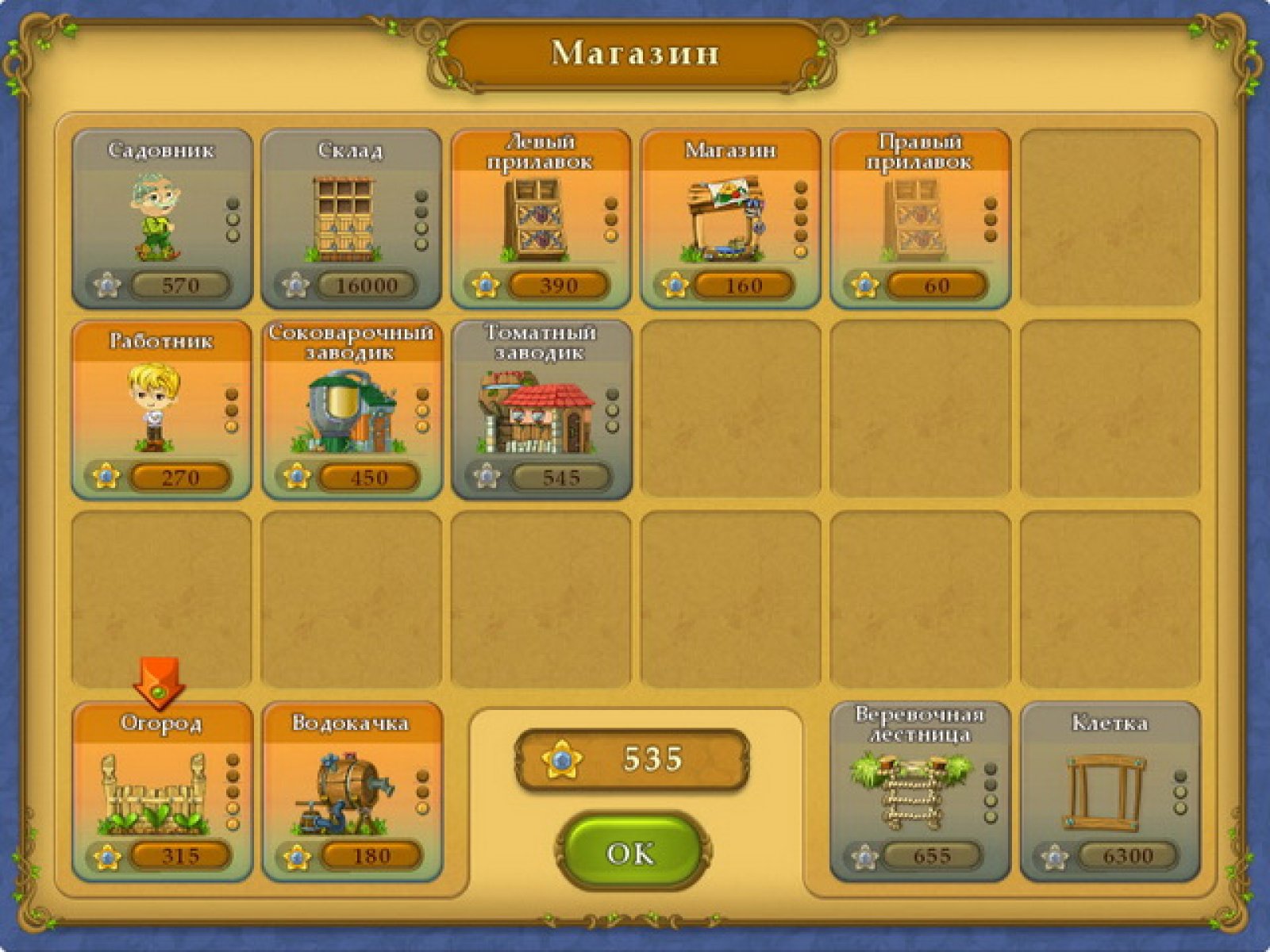 Предприимчивая Джой решила заняться фермерством. Но получится ли у милой девушки превратить красивый, но неухоженный сад в источник дохода? Ей нужен толковый партнер! Организуйте на ферме все этапы работы - от выращивания овощей до их продажи в магазине. Подготовьте место под огород, пригласите опытного садовника. Запаситесь семенами и водой. А чтобы садовник быстрее приносил созревшие продукты на склад, установите специальные веревочные лестницы: они обеспечат быстрое передвижение по ферме. И не забывайте оберегать огороды от наглых воришек! Из склада отгрузите овощи в магазин, где уже толпятся нетерпеливые клиенты - пока это только соседские мальчишки и бывалые фермеры. Но то ли еще будет!