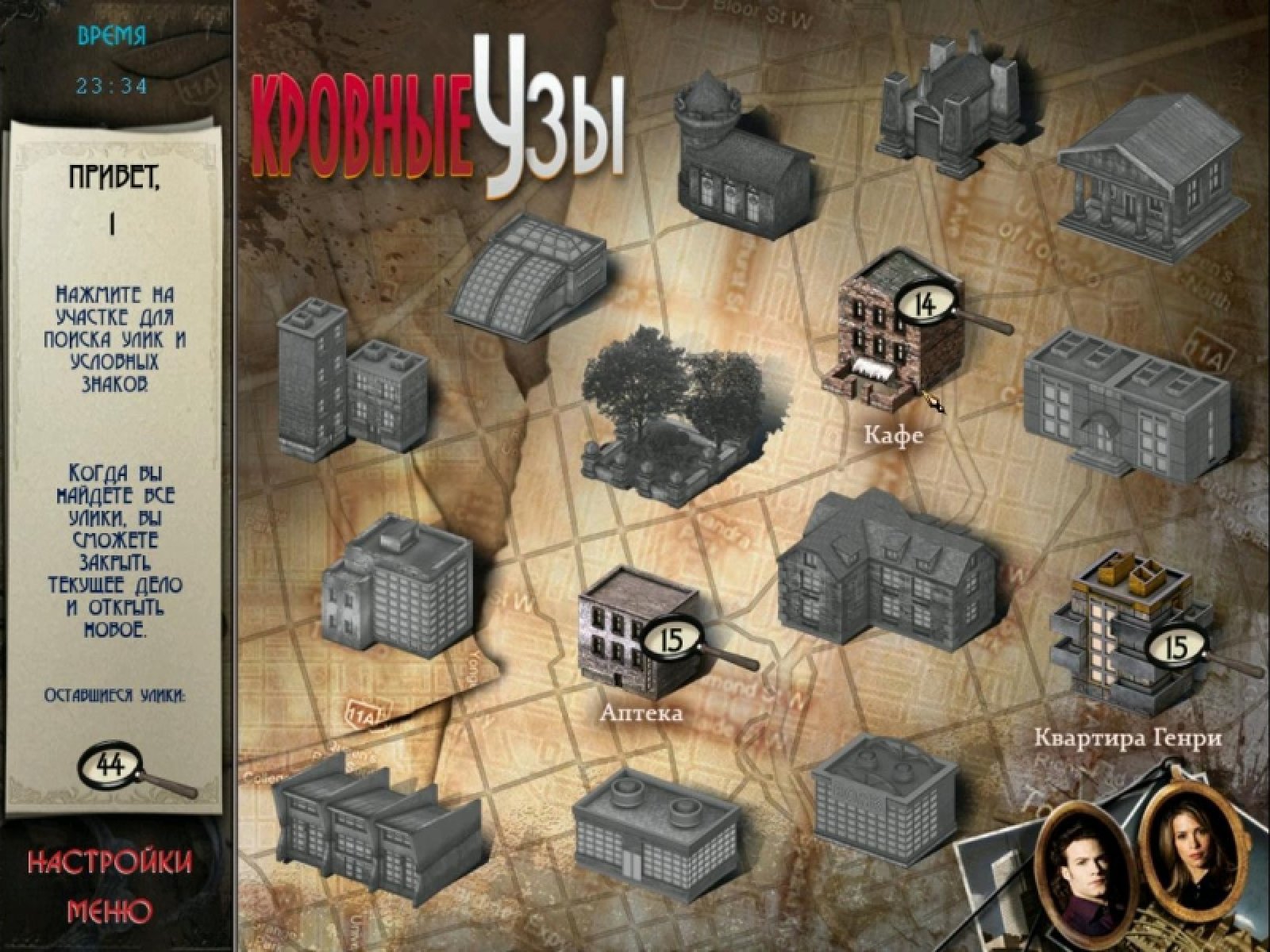 Мистические приключения в стиле "поиск предметов". Игра по мотивам популярного детективного телесериала. Помогите Викки и Генри расследовать дело об исчезновении группы "охотников на демонов", известной как "Клуб адского пламени". Колоритные персонажи делают игру по-настоящему неординарной. Генри - законопослушный вурдалак, однажды решивший стать частным детективом. Его напарница, Виктория Нельсон, раньше служила в полиции, но потом открыла свое детективное агентство. Профиль Виктории - преступления, связанные с религиозными сектами. Игровой процесс "Кровных уз" ориентирован на опытных сыщиков. Приходится обходиться минимумом подсказок, что делает игровой процесс особенно напряженным и эмоциональным. Но ситуация не безнадежна, дополнительные советы можно заработать, собирая спрятанные в локациях магические пентакли.