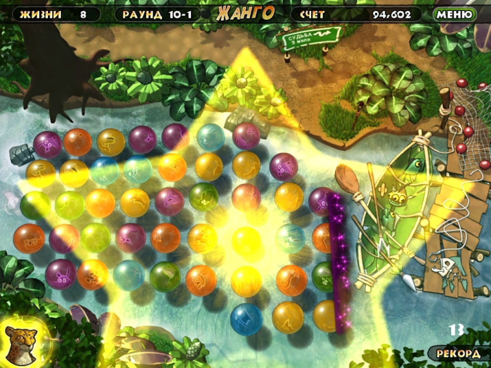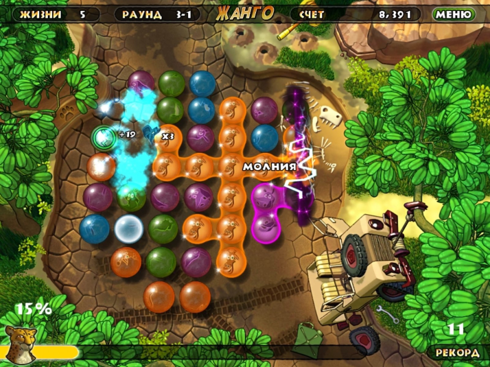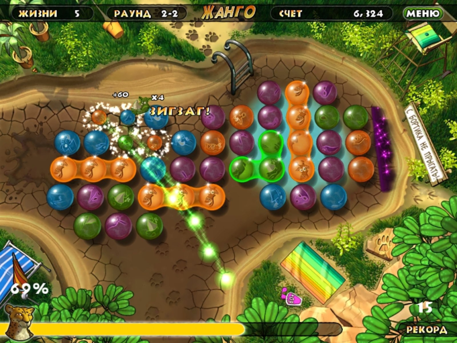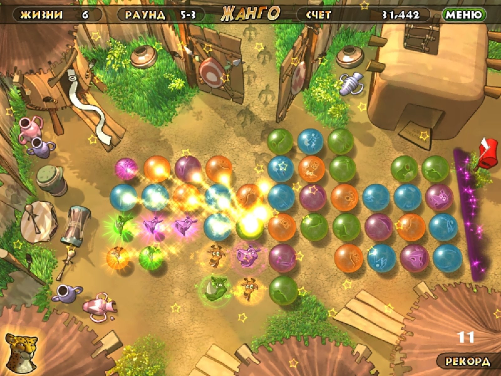 В одной сказочной саванне звери долгое время жили в мире и согласии. Но однажды злобный стервятник-колдун по имени Варгас задумал страшное злодейство. Он заключил всех зверей в магические сферы. И только отважный гепард Чейс не попал в ловушку, потому что весь день охотился на равнине. Теперь он должен разрушить чары злого колдуна и освободить несчастных зверей. Оригинальную механику игры "Жанго" можно отнести к жанру "три в ряд". Вам нужно менять местами сферы, составляя группы по три и более. Чем больше сфер в группу вы соберете, тем быстрее наполняется емкость с энергией. как только эта емкость наполнится, вы получите магическую звезду. И, собрав с ней группу сфер, вы освободите всех зверей, находящихся на игровом поле. Сможете ли вы одолеть колдуна Варгаса, чтобы спасти милых зверушек от злодейской магии?