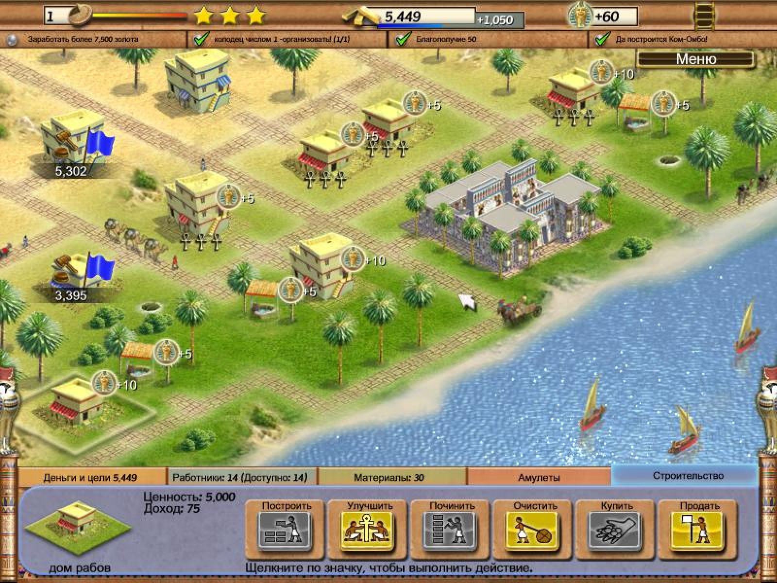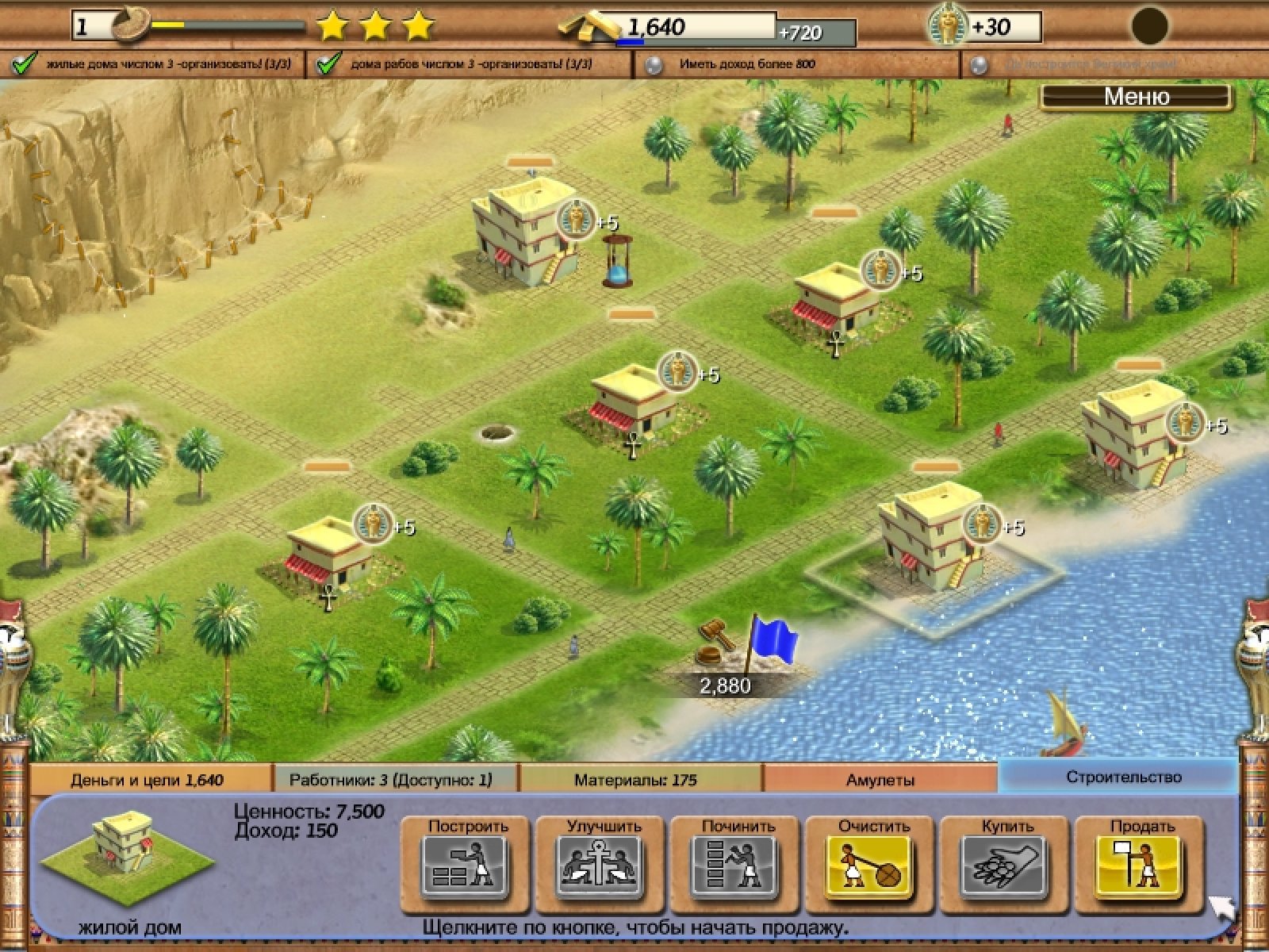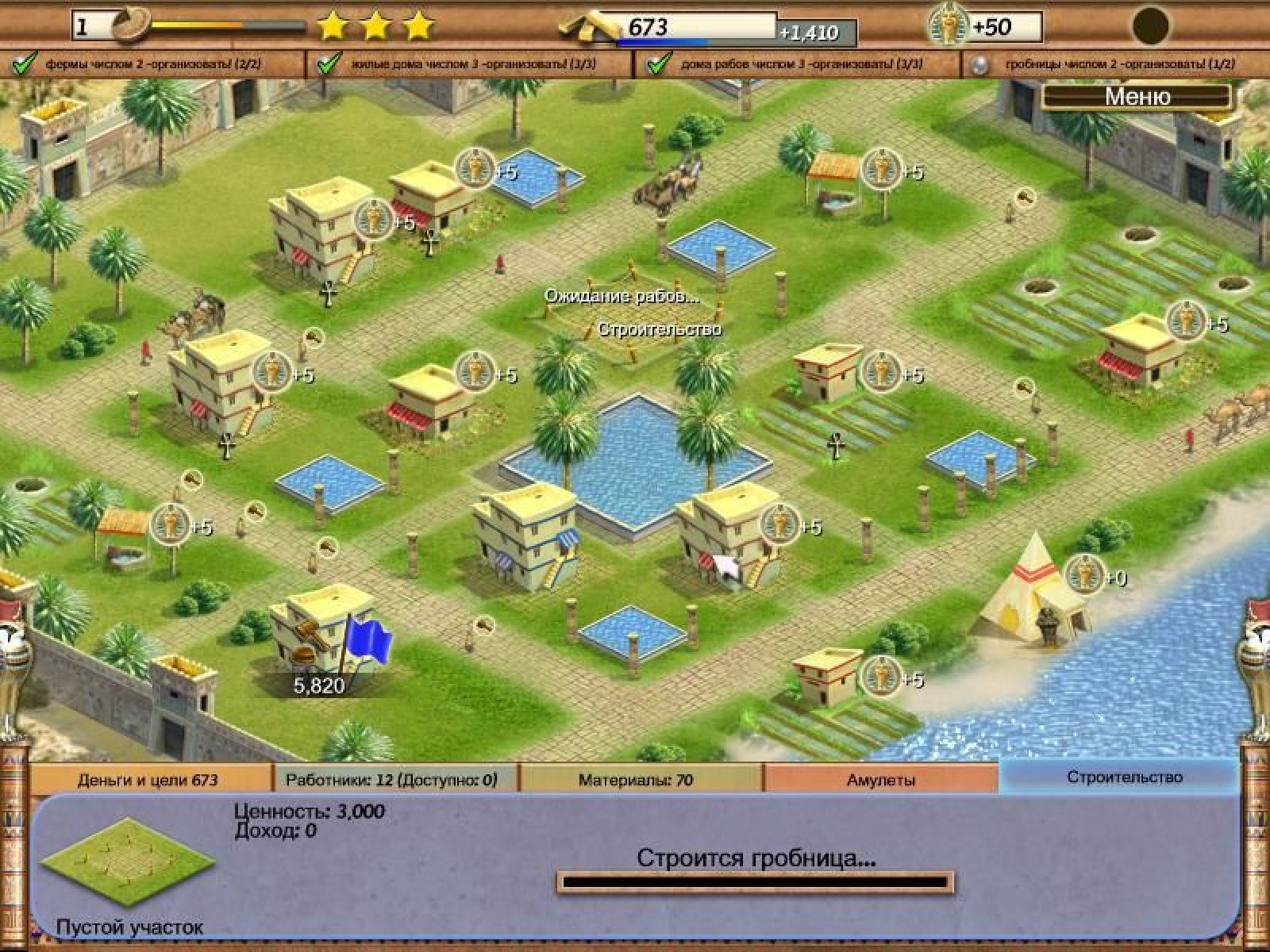 Представьте, что вы оказались в Древнем Египте. Хотели бы вы принять участие в строительстве одной из самых могущественных цивилизаций мира? Ведь именно вам Фараон желает поручить это ответственное задание. Но сначала вам необходимо попробовать свои силы в более простых задачах. Постройка жилых домов для рабов, их модернизация, покупка и продажа построек — весь полученный опыт пригодится вам в будущих, более сложных задачах. Симулятор "Тайны Египетских Пирамид" перенесет вас во времена процветания Древнего Египта. Пройдя обучающий уровень, в котором вы приобретете навыки руководства рабами, научитесь выгодно покупать и продавать постройки, а так же улучшать их, вы получите первое серьезное задание. Красивая игра "Тайны Египетских Пирамид" понравится всем любителям экономических стратегий и симуляторов бизнеса, а также тем, кто только начинает знакомиться с этими популярными жанрами. Задания различной сложности, подробный инструктаж на обучающем уровне, красивая графика и приятное звуковое оформление - всем этим может похвастаться эта увлекательная игра.