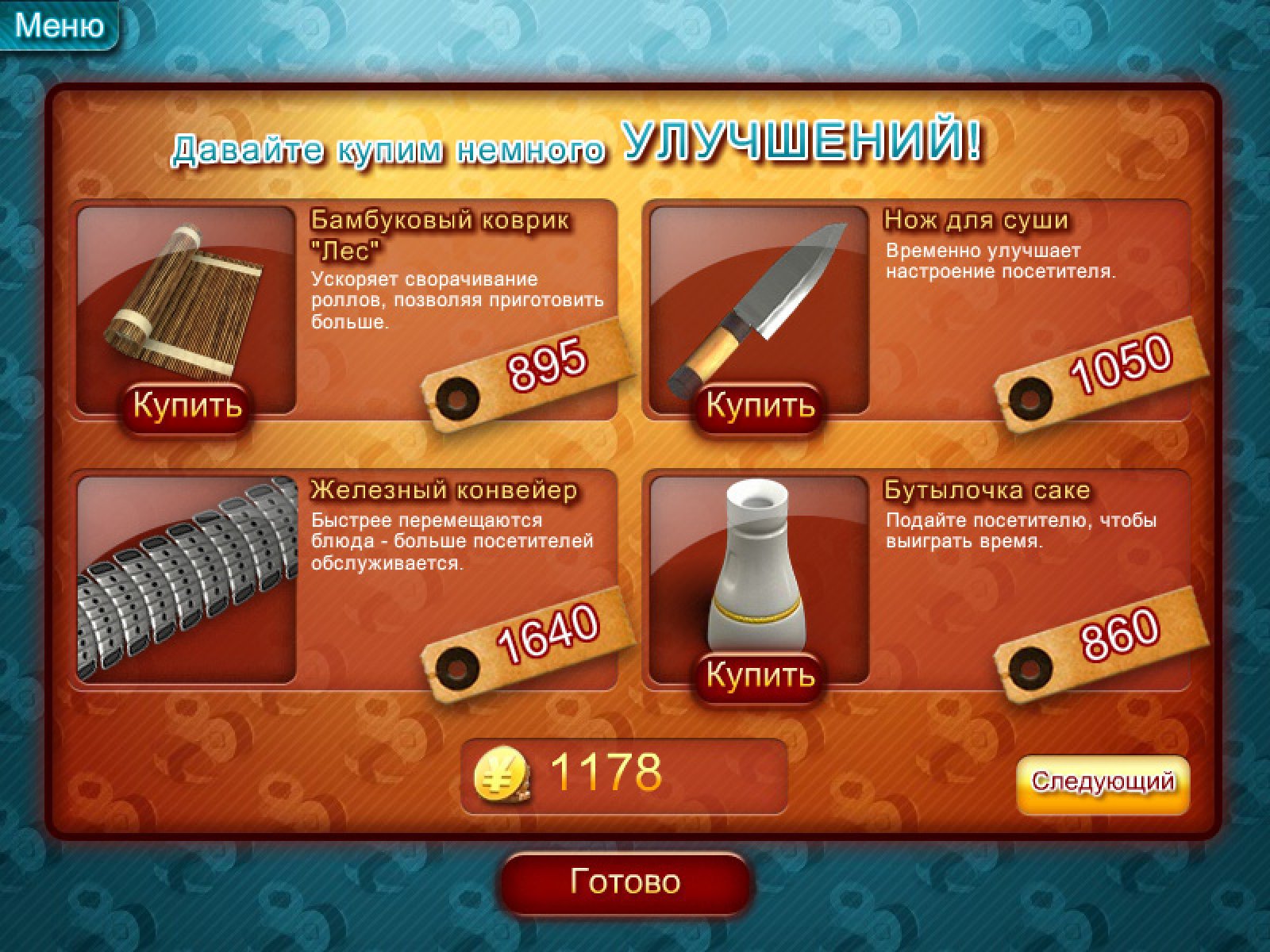 Попробуйте себя в роли повара, готовящего разнообразные суши. Вам предстоит иметь дело с требовательными клиентами ресторана, не терпящими долгого обслуживания. Ваша задача приготовить из имеющихся ингредиентов суши и поставить блюдо на движущуюся ленту, которая доставляет их клиентам. Внимательно изучите рецепты приготовления: если вы ошибетесь в количестве того или иного ингредиента, это будет пустой тратой продуктов. А продукты имеют свойство заканчиваться, и их необходимо заказывать. Увлекательная игра "Youda Суши Шеф" - увлекательный симулятор ресторана со своими особенностями. Постоянно пополняющийся ассортимент рецептов приготовления суши и разнообразные улучшения оборудования выгодно отличают эту игру от подобных. Продолжайте завоевывать новые города, принося в них отличные рецепты различных роллов и суши. Ведь в каждом городе найдутся истинные ценители настоящей японской кухни.