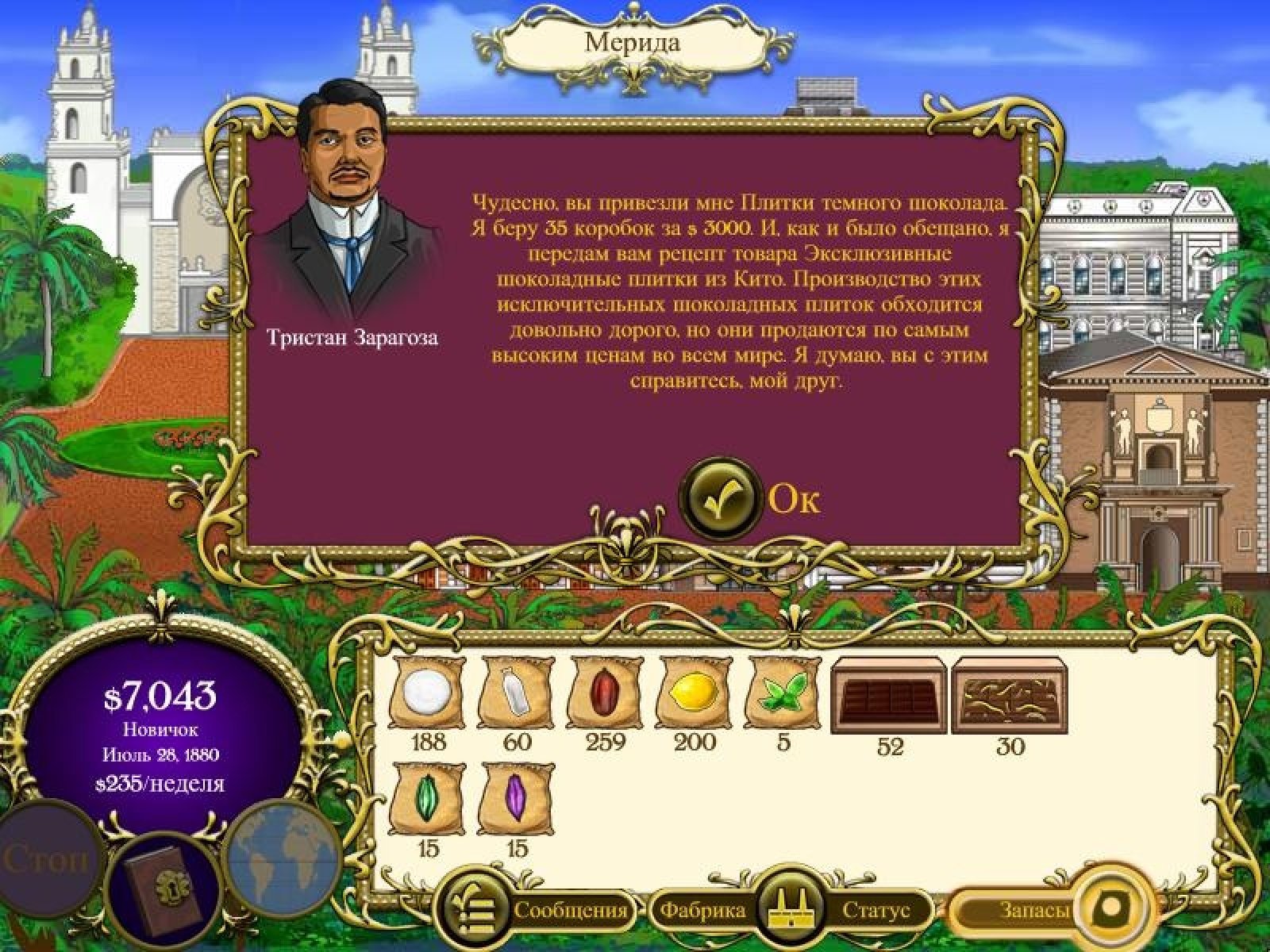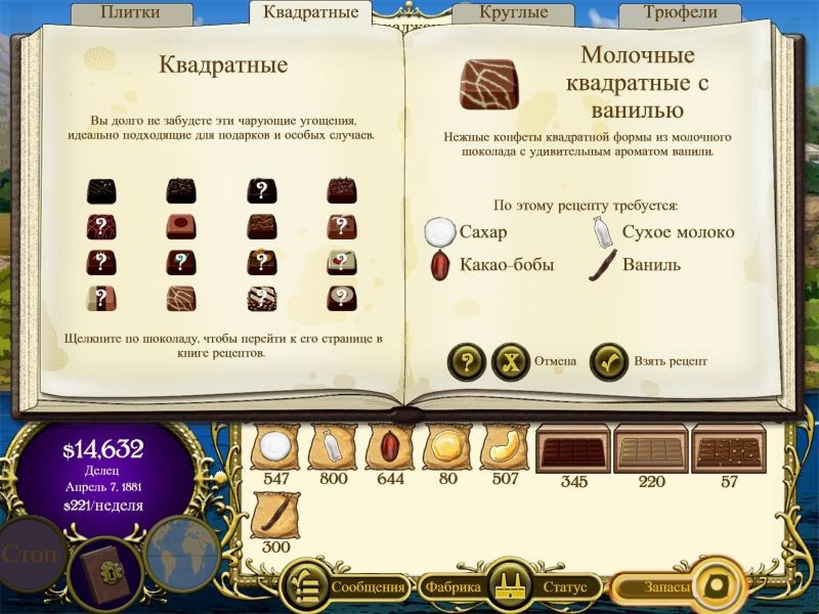 В увлекательной игре "Шоколатор" вам предлагается возглавить производство самого лучшего шоколада и стать партнером фирмы "Кондитерские изделия Баумайстер" - известной и уважаемой компании. Но в данный момент ее дела пришли в упадок. Рецепты лучшего шоколада утрачены и находятся в разных концах света. И вам предстоит собрать эти рецепты и организовать производство шоколада. Для начала владелица фирмы "Кондитерские изделия Баумайстер" - Эванжелин Баумайстер - предоставит вам небольшое количество средств, ингредиенты и рецепт для производства самых простых шоколадных плиток. А дальше дело за вами! Расширяйте ассортимент, открывайте новые фабрики, путешествуйте по свету в поисках новых рецептов, выгодно продавайте свою продукцию. И тогда вы удостоитесь статуса "Главный кондитер". Увлекательная игра "Шоколатор" - это смесь из нескольких жанров. Тут и стратегия, и симулятор бизнеса, и увлекательные мини-игры. Развивайте собственное дело по производству отменного шоколада, и вы завоюете признание по всему миру, как лучший производитель сладостей.
