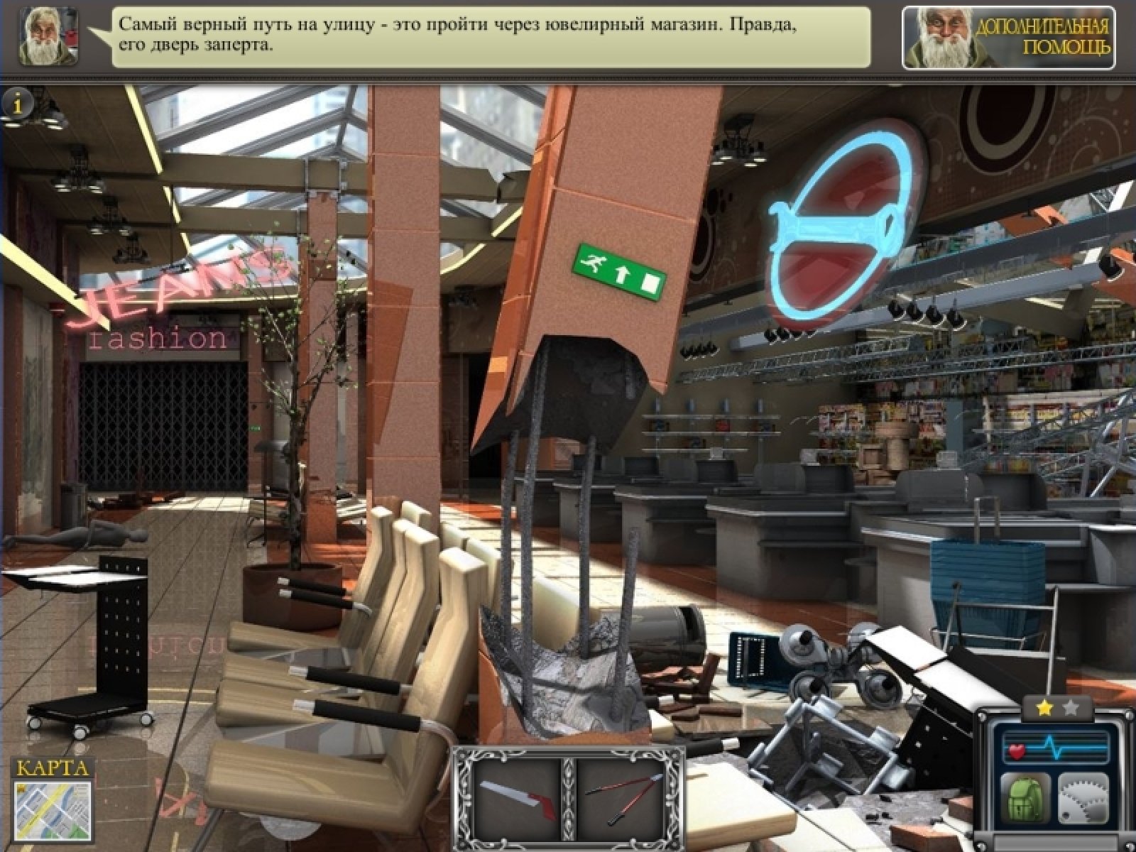 Представляем вам финальную часть игры «Побег из музея». Вы, конечно же, уже знакомы с Сьюзен и ее дочерью Кейтлин. На этот раз они отправились в музей, а отец Кейтлин остался дома. Постепенно он заснул, и ему приснился сон, в котором в городе опять произошло страшное землетрясение. Проснувшись, он осознает, что землетрясение было на самом деле. Город сильно пострадал, телефоны не работают, на улицах много пострадавших. Опасаясь за судьбу жены и дочери, он решает добраться через полуразрушенный город до музея. Но на его пути множество препятствий. Сможет ли главный герой добраться до музея? Замечательный квест «Побег из музея. Финал» продолжает историю, рассказанную в играх «Побег из музея» и «Побег из музея 2». На этот раз вы будете играть за мужа Сьюзен, сотрудницы городского музея. Пробираясь по поврежденным улицам города, вы столкнетесь с многочисленными головоломками, будете преодолевать препятствия, повстречаетесь с жителями города, напуганными сильным землетрясением. Увлекательная игра «Побег из Музея. Финал» продолжает традиции первых двух частей серии. Отличная графика, увлекательный геймплей, звуковое оформление, передающее атмосферу игры – все направлено на то, что бы вы погрузились в мир опасностей и приключений, пробираясь через разрушенный город к Сьюзен и маленькой Кейтлин. Сможете ли вы вовремя прийти к ним на помощь? Самое время проверить.