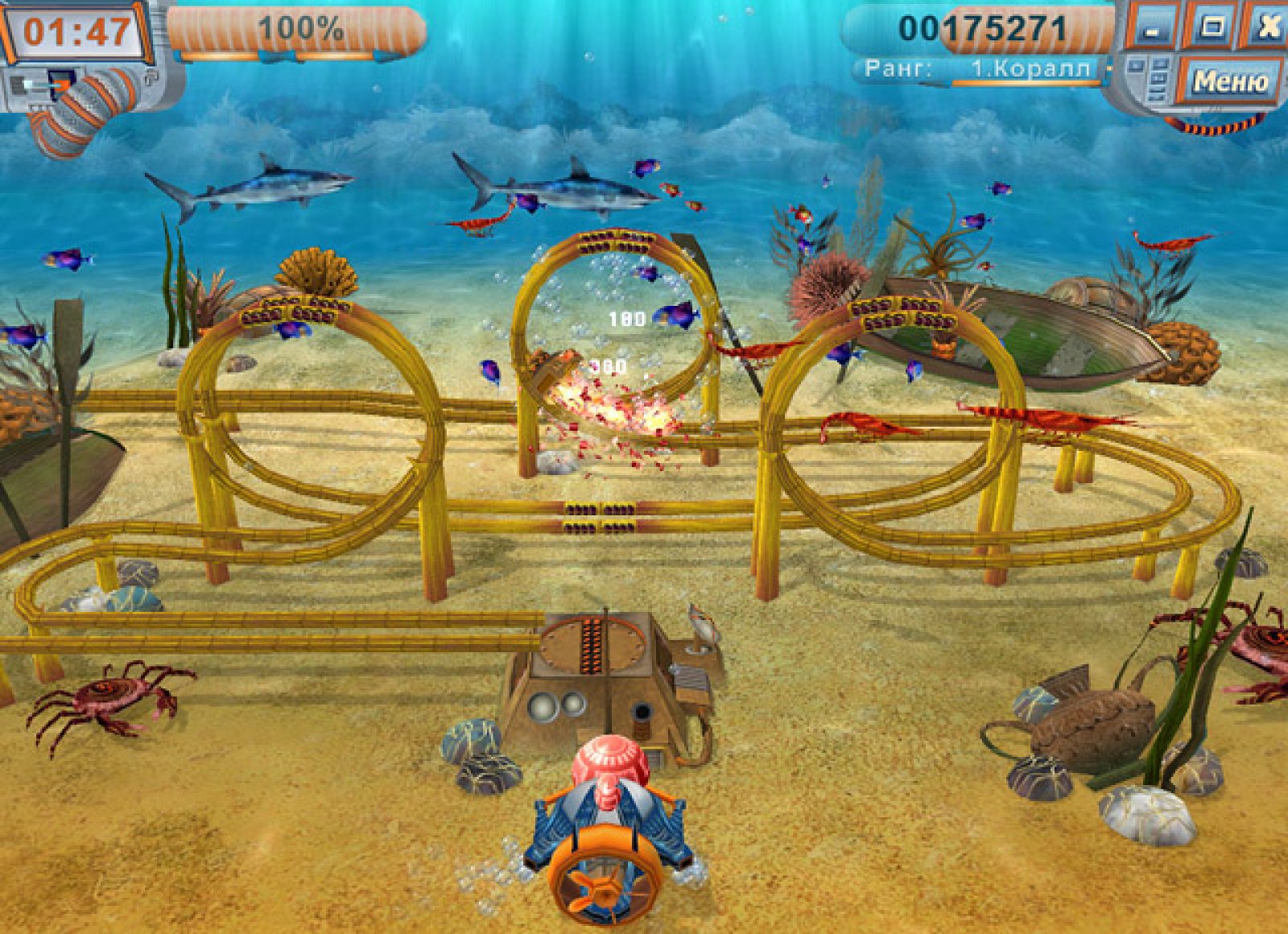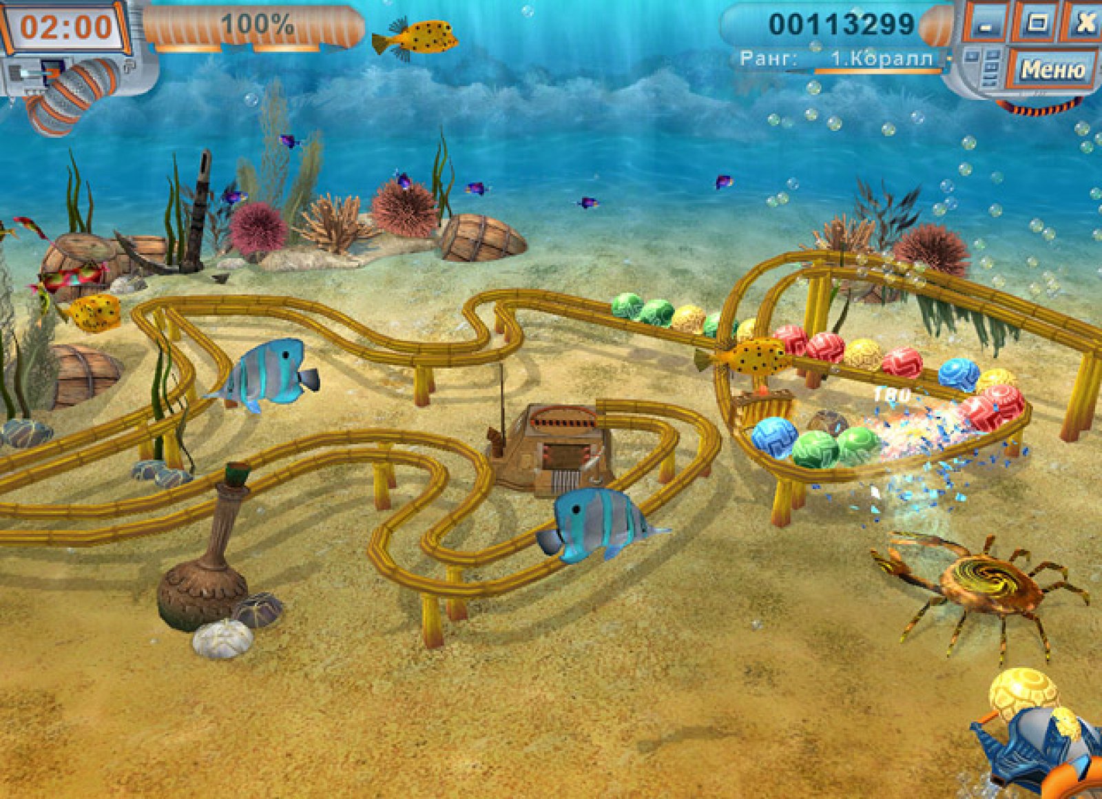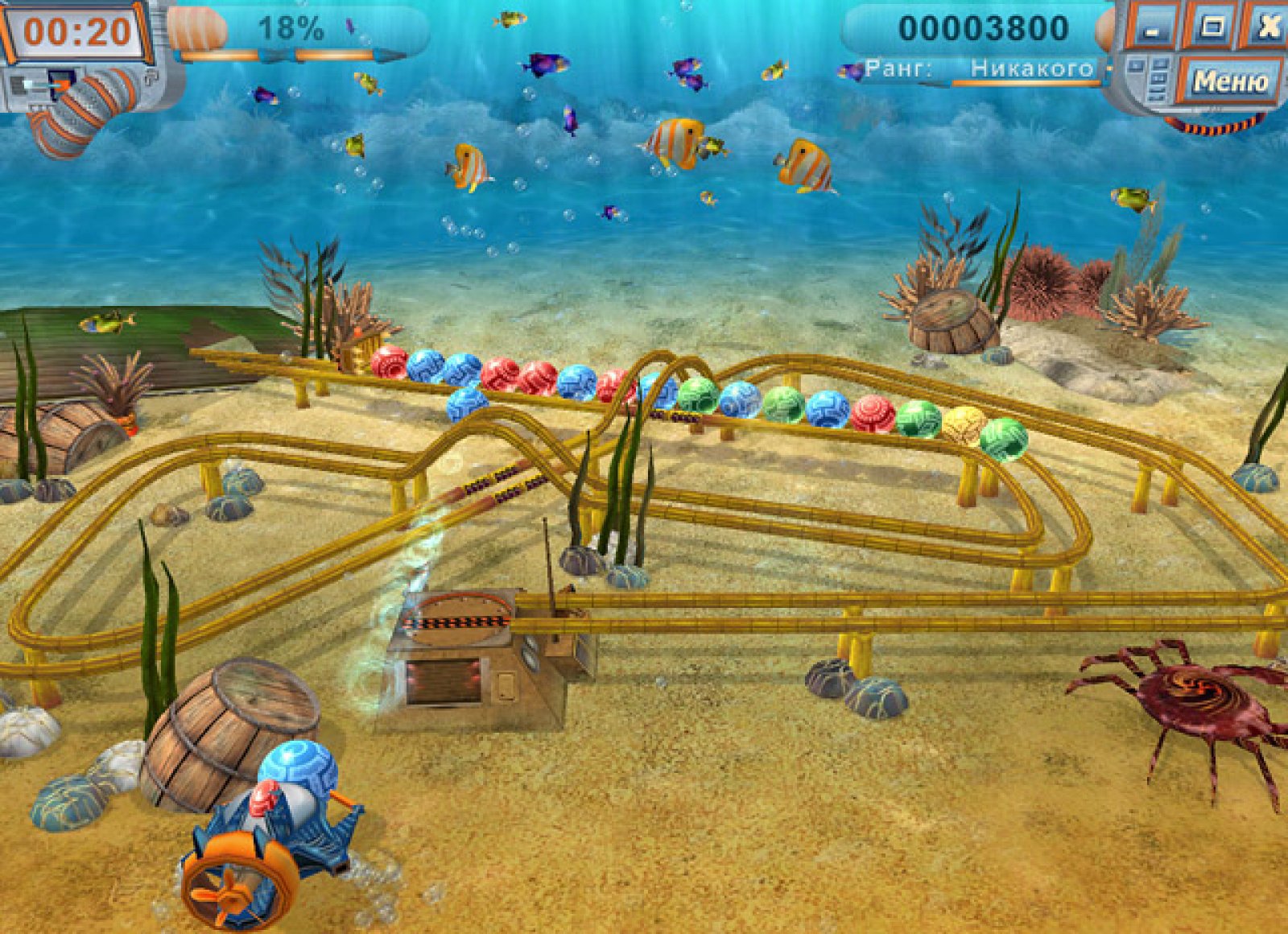 В далеком будущем человечество оказалось на пороге техногенной катастрофы. Подводные машины, которые должны были очищать моря и океаны от мусора и ядовитых отходов, сошли с ума и начали уничтожать всех обитателей мирового океана. Остановить очистные заводы было невозможно. И тогда мировая общественность призвала на помощь добровольцев, снабдив их уникальными подводными лодками. Они должны били уничтожить взбунтовавшиеся машины. И вы один из этих добровольцев. Эта игра являет собой продолжение традиций легендарной Зумы. Управляя подводным кораблем вам необходимо стрелять разноцветными шариками в движущуюся цепочку таких же шаров так, чтобы, вклиниваясь в эту цепочку, они образовывали группу в три и более одноцветных шариков. В этом случае одинаковые шарик исчезнут. Цель прохождения уровня – убрать все появившиеся цепочки. А помогут вам в этом многочисленные бонусы, которые нужно ловить после особо удачных выстрелов. Отличная игра «Тайна шести морей» полностью трехмерна. Отлично прорисованный подводный мир, рыбки, которые заслоняют обзор и которых нужно отгонять курсором, а так же различные условия на том или ином уровне подарят вам множество приятных и азартных минут вашего свободного времени.