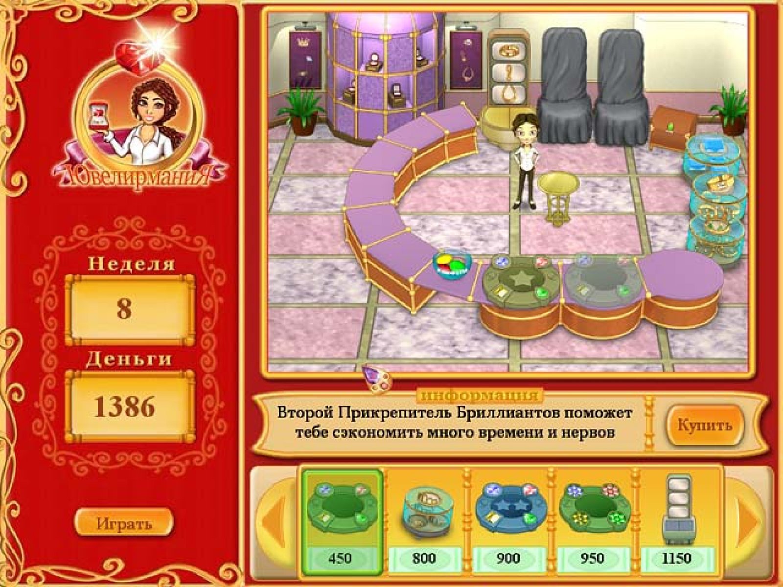 Однажды, в один обычный вечер, владелец ювелирного магазина пришел домой очень усталым. Он всерьез стал подумывать о передаче своего дела кому-нибудь из своих четырех дочерей. Но у трех из них уже были собственные магазины, и только юная Элли, только что закончившая колледж, могла бы продолжить семейное дело. Конечно, Элли сперва была взволнована такой неожиданной новостью. Но, придя с отцом в его магазин, она с энтузиазмом взялась за дело. Красочная игра «Ювелирмания» создана в жанре «тайм-менеджмент» и несет в себе все прелести жанра. К вам приходят посетители за оригинальными ювелирными изделиями. Вам их нужно сделать и отдать клиенту. Чем быстрее вы обслужите покупателя, тем больше получите чаевых. На заработанные деньги вы сможете приобрести дополнительное оборудование для магазина. Старайтесь не заставлять покупателей ждать, а то они могут уйти, что плохо скажется на репутации вашего ювелирного салона. Постепенно ваш магазин будет расширяться, превращаясь в огромный супермаркет по продаже элитных ювелирных изделий. Игра «Ювелирмания» обладает всеми прелестями симуляторов магазина. Отлично прорисованные интерьеры, различные типы покупателей, каждый со своим характером, к тому же оригинально озвученный, дают возможность прикоснуться к самой модной и дорогой области торговли – к торговле уникальным ювелирным изделиям.