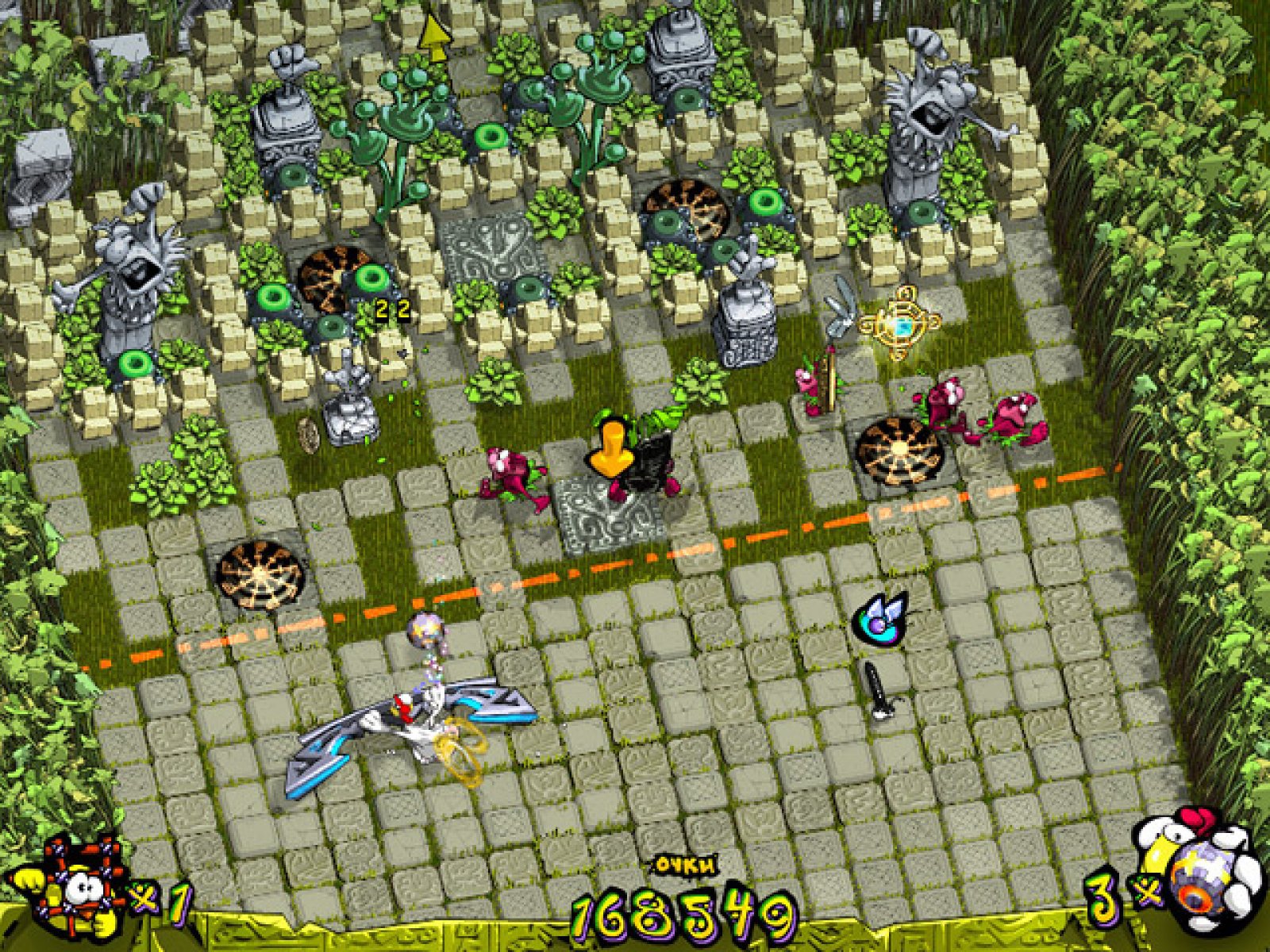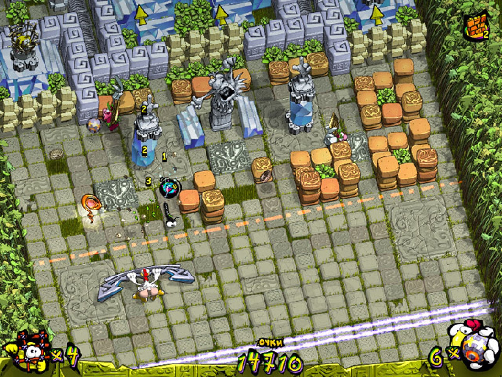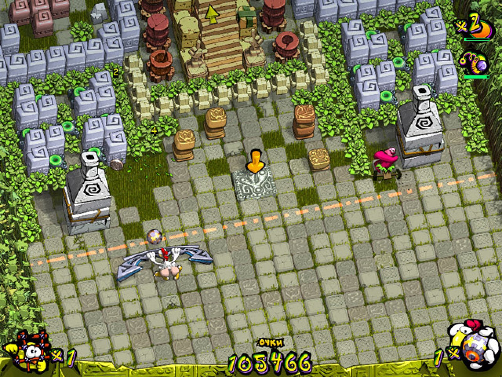 Веселый арканоид для всей семьи «Куриная Атака. Эпизод 2» создан в лучших традициях жанра. Управляя курицей по имени Паула с помощью мышки, вам нужно отбивать шарик ракеткой так, что бы он при отскоке разбивал блоки на игровом поле. Целью каждого уровня в игре является спасение несчастных цыплят, которые попали в плен к аборигенам и томятся в клетках. Разбивайте каменные блоки и статуи, расчищая дорогу к клеткам. Среди развалин водится также и более мелкие представители фауны. Некоторые из них добавляют Пауле бодрости и полезные способности. А вот другие плохо влияют на пищеварение и всячески мешают сосредоточиться на главной задаче – спасении бедных цыплят. Веселая и остроумная игра «Куриная Атака. Эпизод 2» понравится всей семье. Знакомый геймплей и, вместе с тем, оригинальные решения приятно удивят истинных поклонников жанра, а начинающим игрокамподарят не мало прияных минут и веселое времяпровождение.