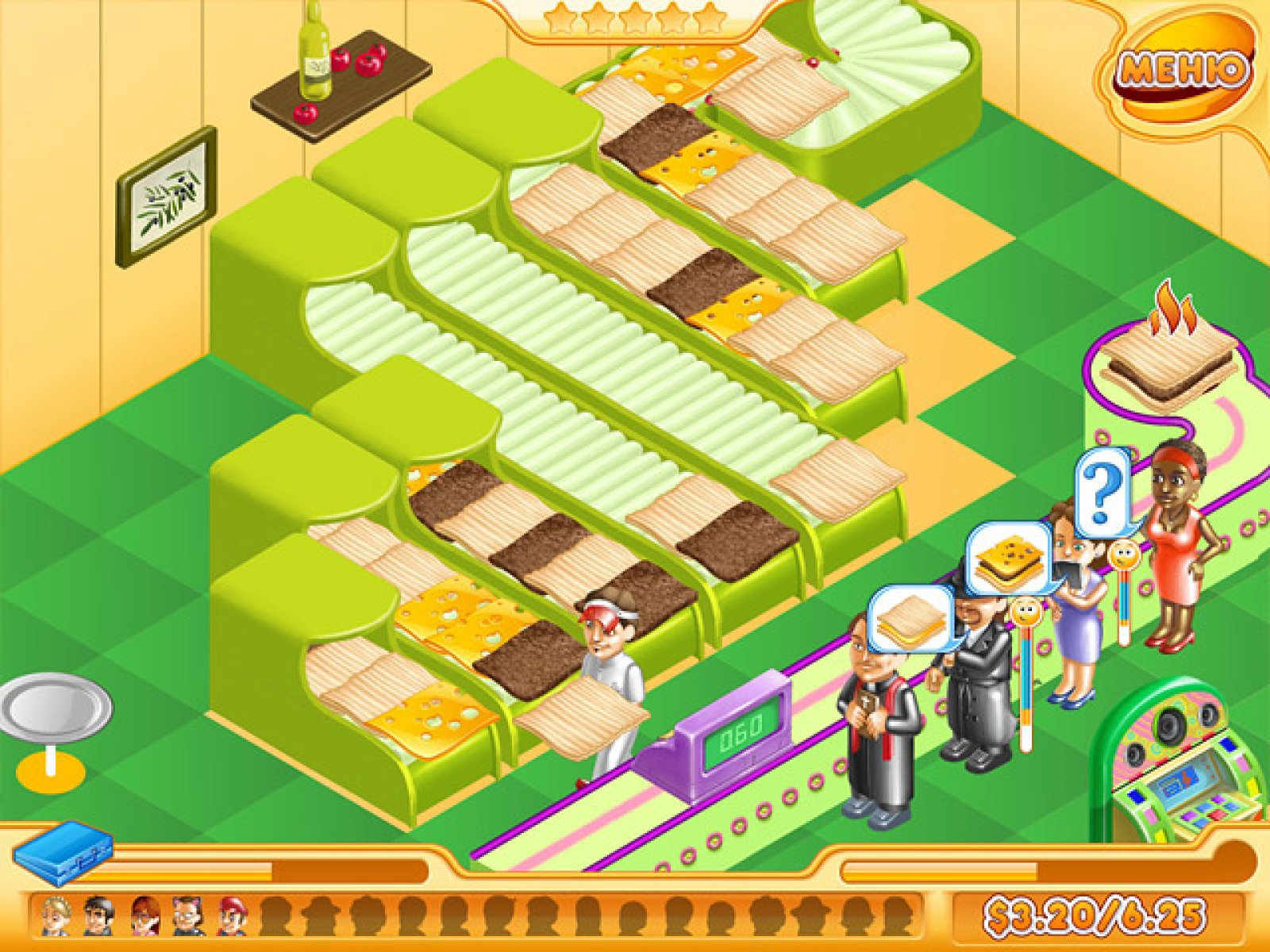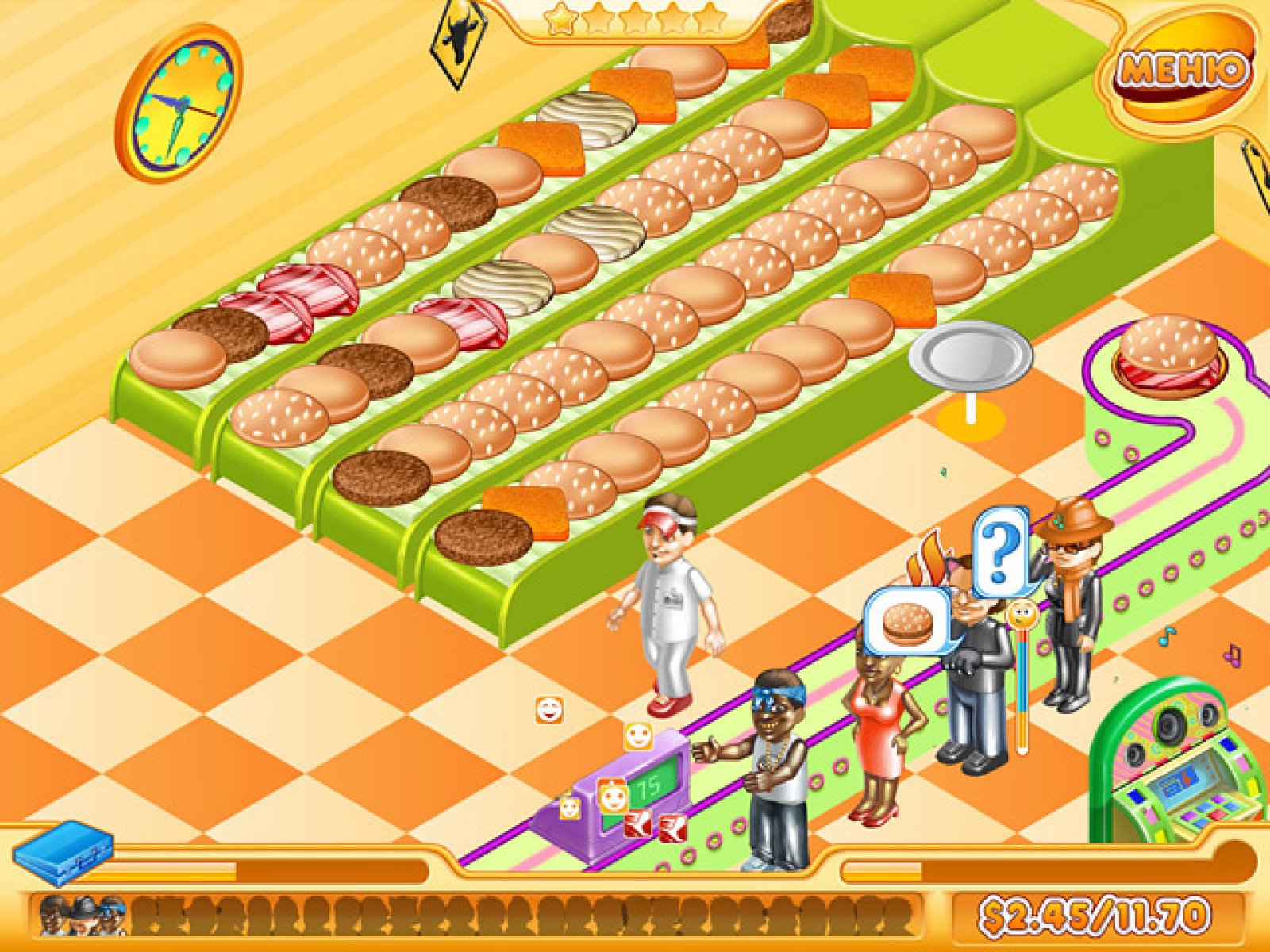 Стать лучшим в городе шеф-поваром ресторана быстрого питания — задача не из легких. Чтобы с честью пройти все испытания, вам понадобятся сноровка, ловкость и умение быстро обслуживать посетителей. Каждый заказ — это небольшое угощение, состоящее из нескольких компонентов. Вам необходимо собрать все части в правильном порядке, разогреть и подать блюдо посетителю. Очень быстро слава о вашем заведении распространится на весь город, а у стойки появятся очереди. Так что поторапливайтесь — чем больше гости ждут, тем меньше чаевых окажется в ваших карманах. Заработанные деньги можно тратить на приобретение улучшений для вашего ресторана. Они помогут вам быстрее обслуживать посетителей, или же увеличат их терпение. Попробуйте разные режимы игры, чтобы лучше разобраться во всех тонкостях. В "Быстрой игре" необходимо обслуживать все ускоряющуюся очередь посетителей, вовремя собирая необходимые заказы. В "Большой игре" вас ждет увлекательный путь к вершинам кулинарного искусства, которое признают даже обитатели отдаленных галактик!
