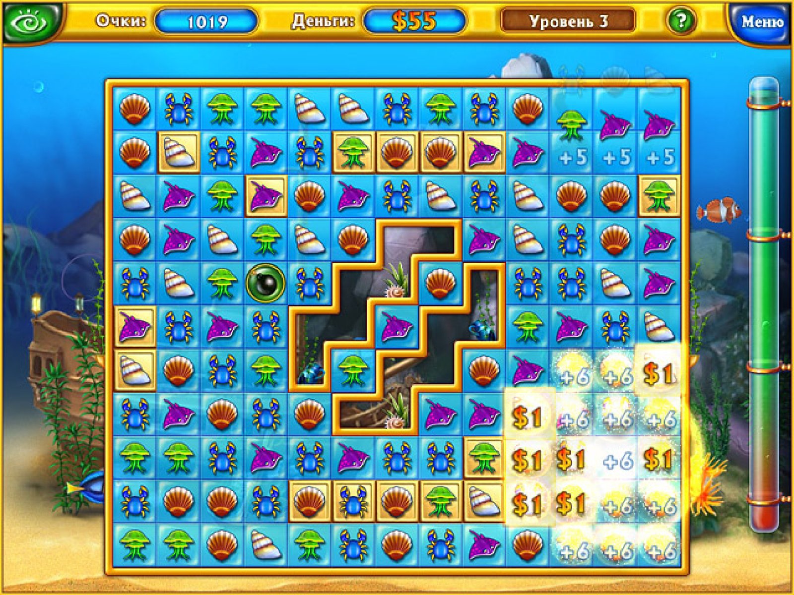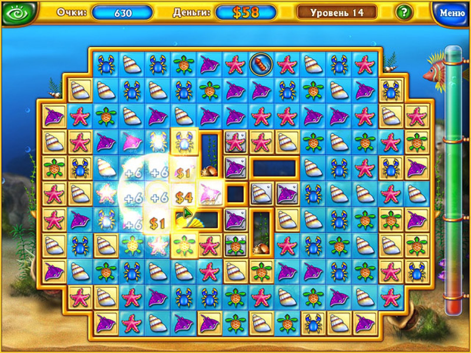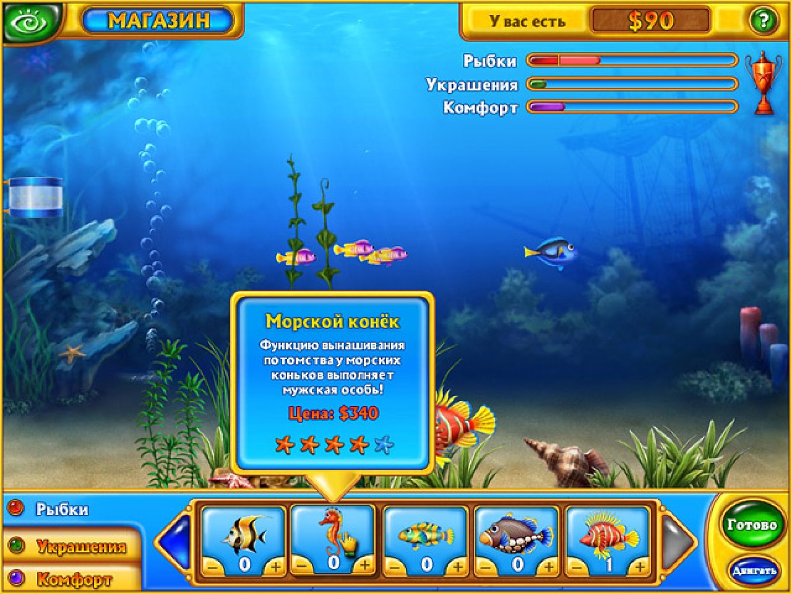 Фишдом - игра в стиле "собери тройку". Вам дается пустой аквариум и вы можете по своему вкусу и цвету заполнить его различной живностью, растениями и приспособлениями для аквариума. Когда вы все это сделаете, то получится красивый скринсейвер. Правда, чтобы и рыбки плавали, и растения шевелились, тут как и в жизни необходимы деньги. Вот их и придется зарабатывать. Приятная и спокойная атмосфера несомненно понравится любителям жанра и рыбок:) В игре три различных окружения, почти сто предметов окружения для аквариума, шикарное оформление и спокойная атмосфера.
