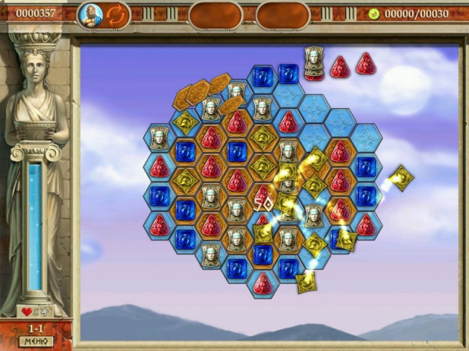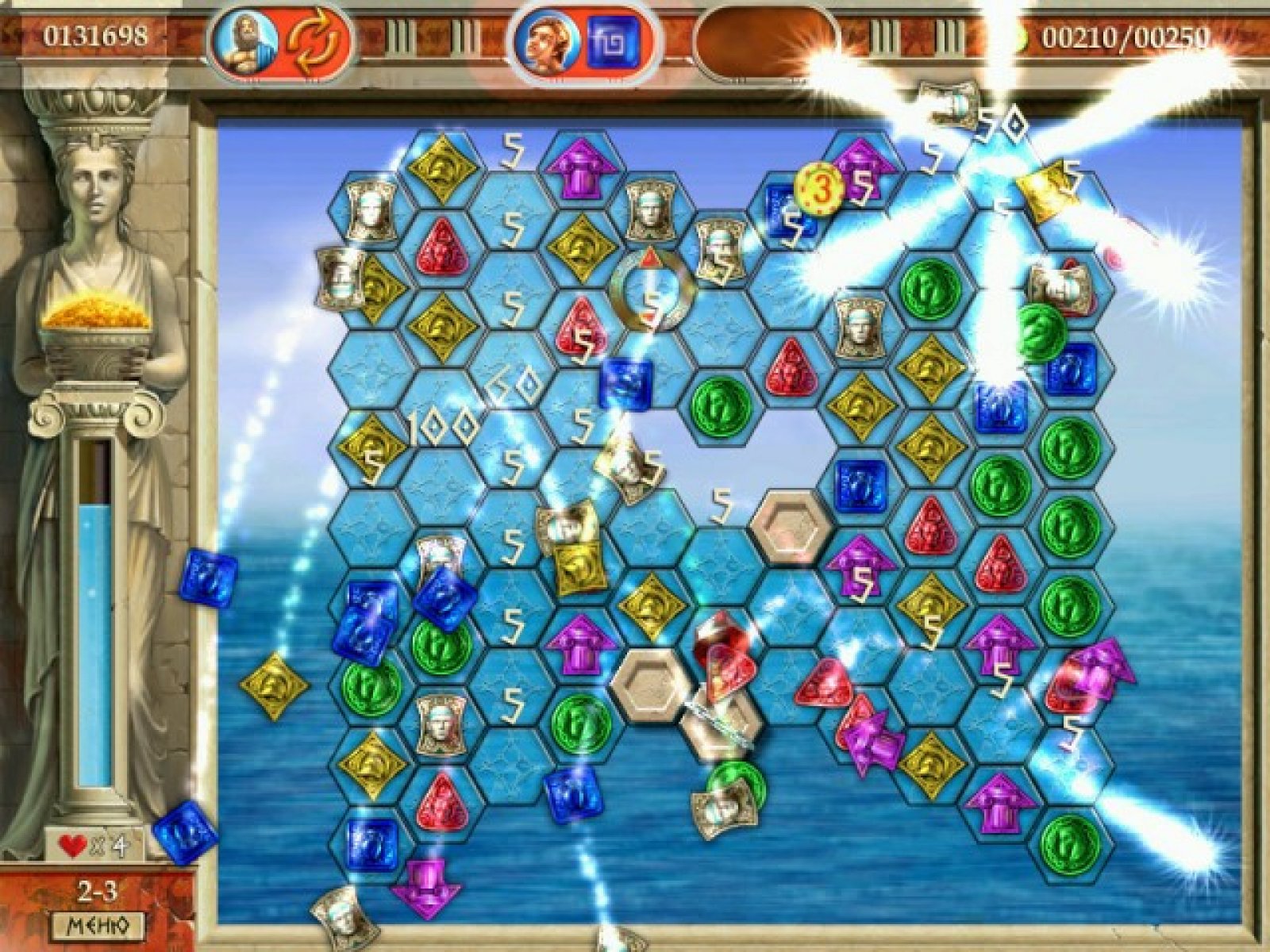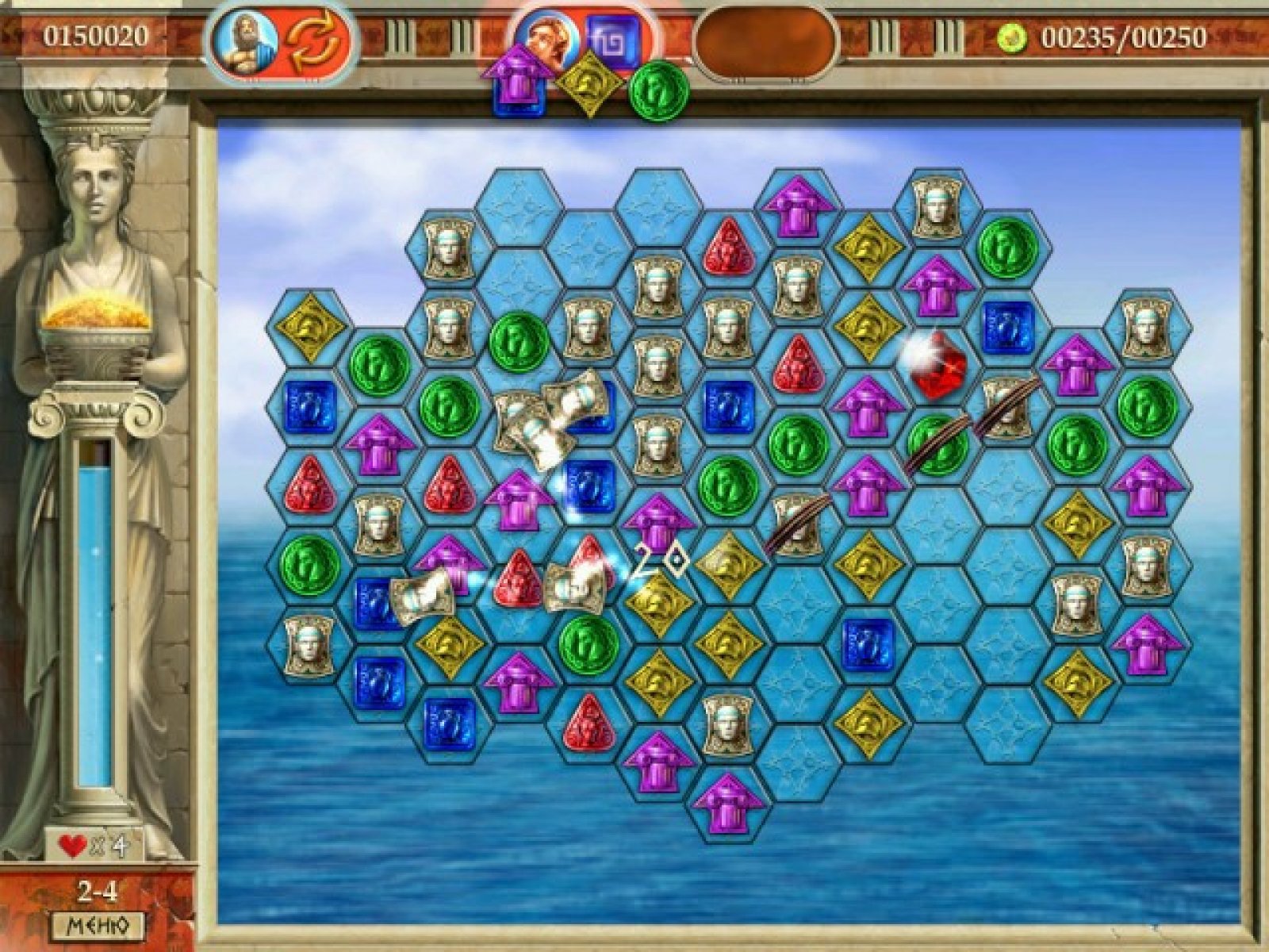 В древние времена в солнечной Греции случилась беда: коварный вор похитил у Зевса священный скипетр власти, который хранил гармонию всего мира. Вам предстоит отыскать этот могущественный артефакт, а для этого придется спуститься в мрачные чертоги подземного царства Аида. Мало кому удавалось столь опасное путешествие, поэтому первым делом соберите надежных попутчиков из числа великих греческих героев. Для этого потребуется золото, которое можно добыть, собирая на игровом поле группы из одинаковых фишек. Сделать это предельно просто — найдите подходящее скопление не менее чем из трех фишек и проведите по ним мышкой. Сразу после этого они исчезнут, а вы получите золотые плитки, расположенные под ними. Герои Эллады понравятся всем поклонникам увлекательных логических аркад. Красочная графика, множество затейливых уровней и дополнительная мини-игра станут настоящим подарком и для детей, и для взрослых.