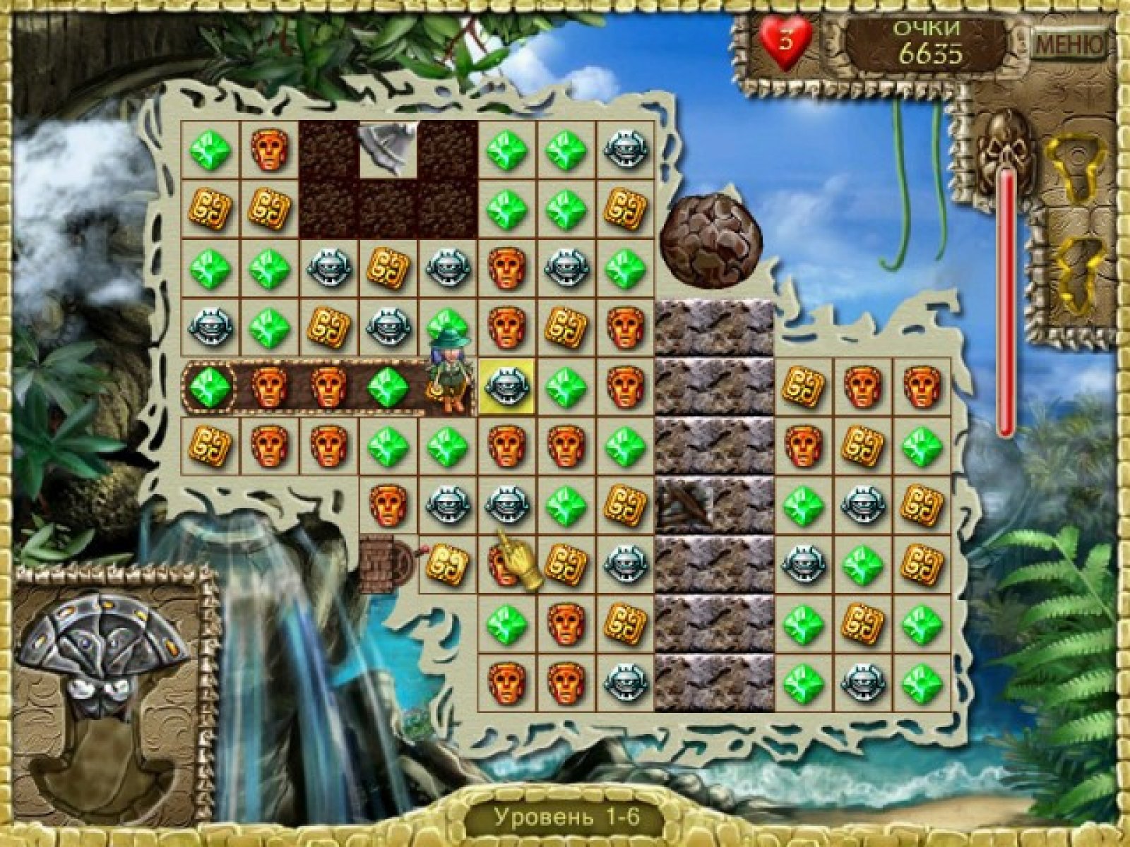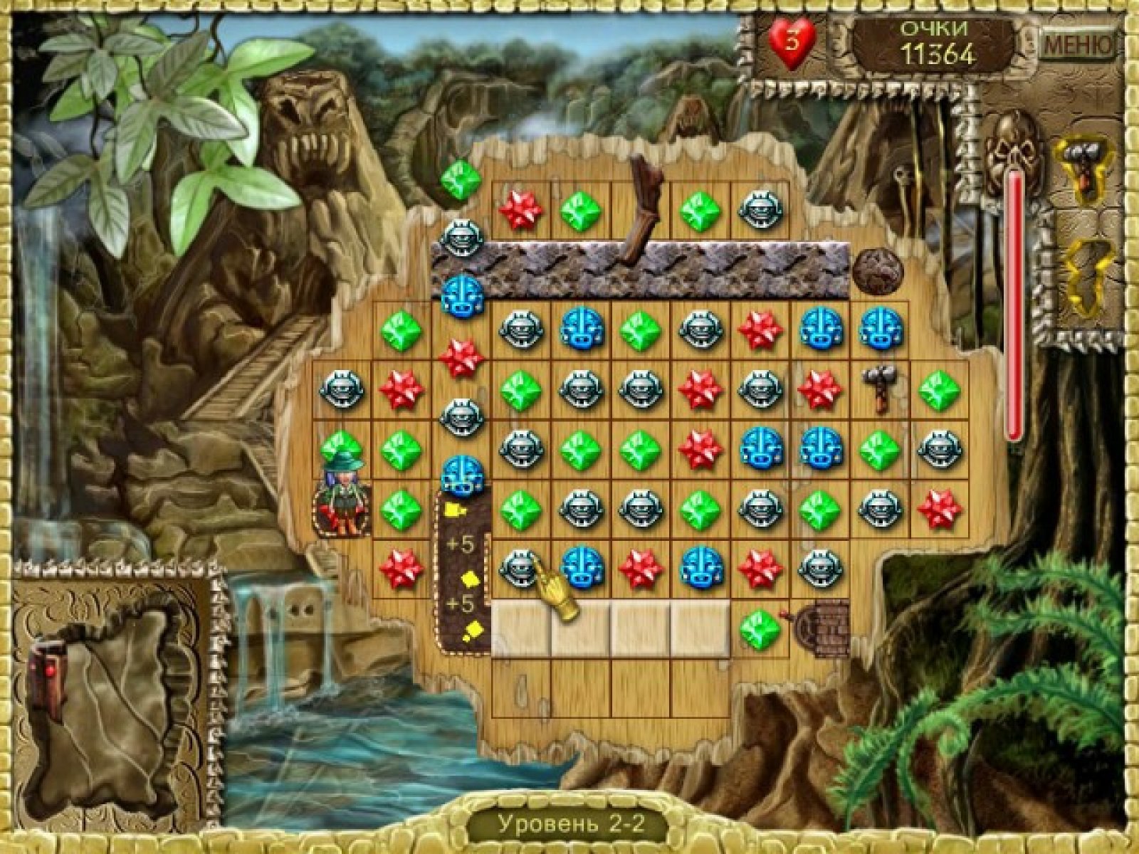 Дик и Джейн - охотники за сокровищами. Они узнали тайну затерянного города Эльдорадо. Оказывается, ключ к несметным сокровищам города сокрыт в семи амулетах инков. Отправившись в джунгли и расшифровав древние наскальные письмена, они узнают, что каждый амулет разбит на несколько частей, и, чтобы использовать его, необходимо собрать все части. Игра представляет собой уже полюбившийся всем механизм "собери тройку". Необходимо. переставляя предметы, собирать их в ряд не менее трех штук, освобождая таким образом все поле. Когда все поле освобождено, появляется часть амулета, которую нужно провести до низа игрового поля. Однако вас ждут и другие уровни с совершенно другими целями прохождения. Отличная динамичная игра с завораживающей музыкой, напоминающей песни индейцев у ритуального костра, и множество сюрпризов в прохождении не оставят равнодушными даже самых взыскательных игроков.