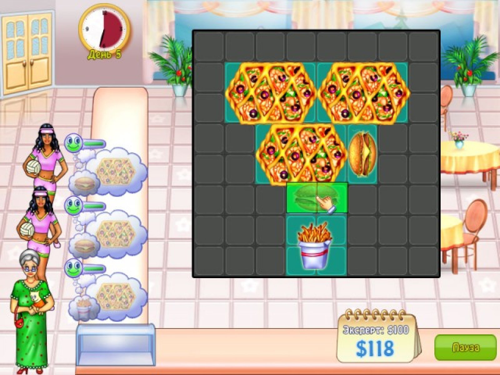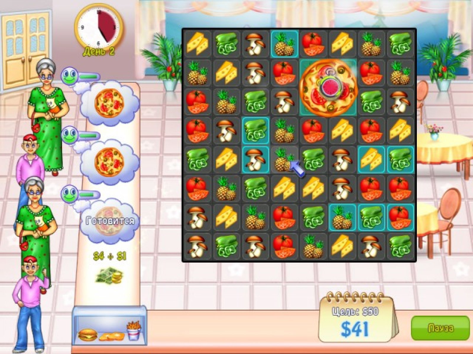 В этой увлекательной игре вам предстоит наладить работу сети собственных пиццерий. Покупатели будут выстраиваться в очередь, пока вы мастерски управляя духовкой, будете готовить ароматные пиццы оригинальных рецептов. Для того чтобы приготовить заказ покупателя, необходимо предварительно включить плитки духовки для размещения пиццы, сокращая на ней одинаковые продукты по три в ряд. Чтобы удовлетворить изысканный вкус всех покупателей и обеспечить доход пиццерий необходимо своевременно покупать новые рецепты пицц, улучшать вспомогательные машины и духовку. Попробуйте себя в роли настоящего шеф-повара и получите удовольствие от процесса приготовления пиццы!