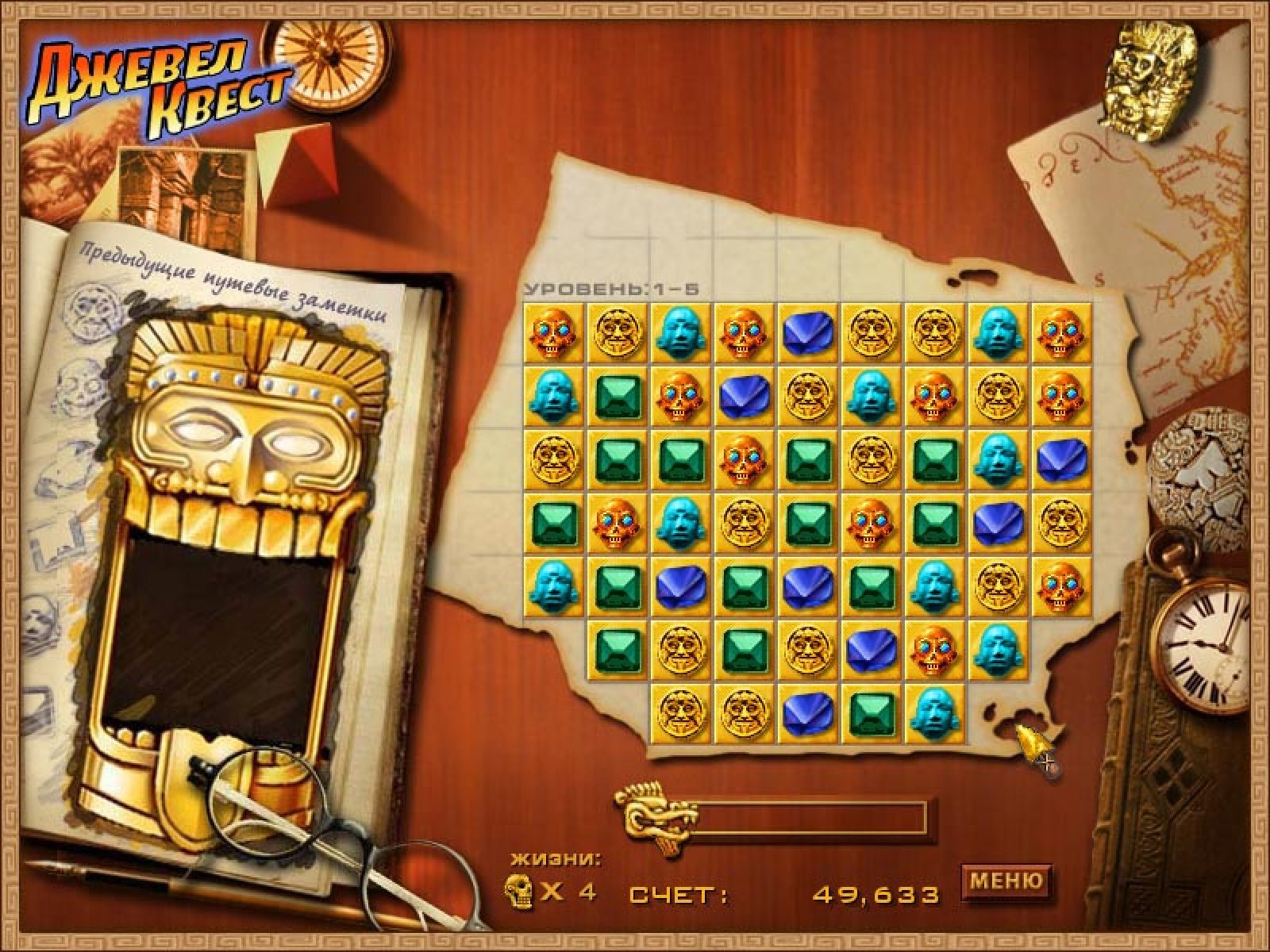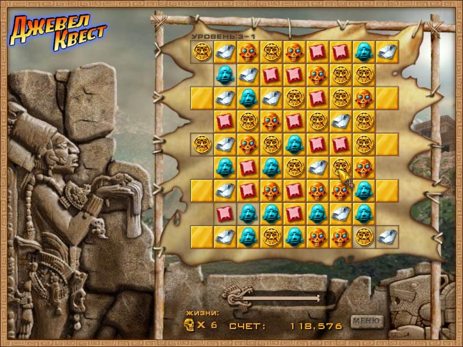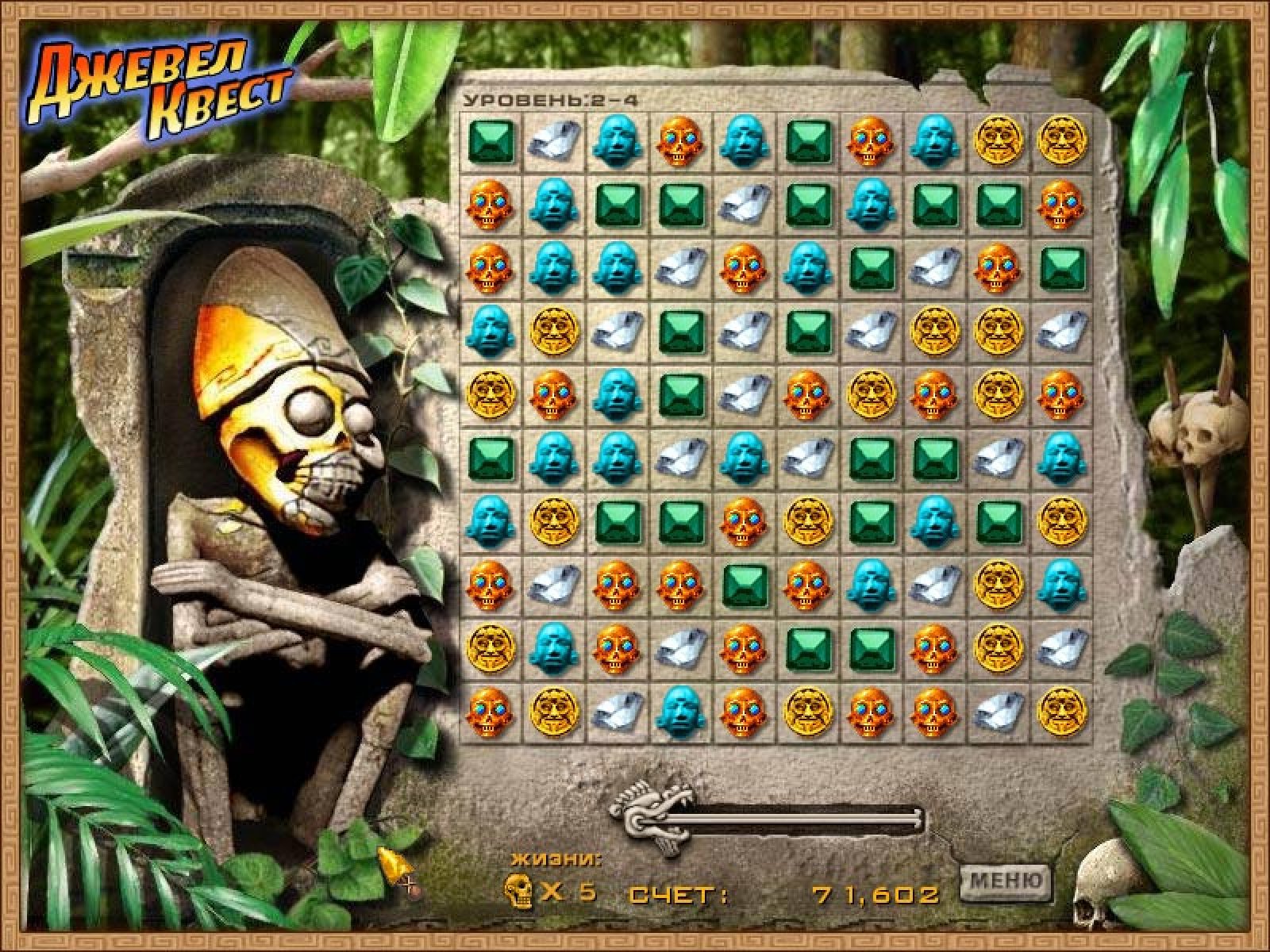 В этой игре вы сможете отправиться в Южную Америку, чтобы отыскать священные Храмы Солнца и вдохнуть жизнь в каменные изваяния древних индейских богов. В благодарность они поделятся своими секретами и, возможно, раскроют вам священную Тайну Мироздания. Выполнить эту миссию вам помогут особые фишки — передвигайте их по игровому полю таким образом, чтобы после каждого хода получалась цепочка не менее чем из трех одинаковых элементов. Каждая цепочка превращает расположенные под ней клетки в чистое золото. Чтобы перейти на следующий этап и на шаг приблизиться к желанной цели — заполните золотыми плитками весь уровень. Поначалу эта задача может показаться слишком простой. Но с каждым уровнем выполнять ее будет все труднее: форма игрового поля меняется самым причудливым образом, а в игру вступают новые фишки, некоторые из которых наделены магическими свойствами. Игра Джевел Квест станет настоящим подарком для истинных ценителей логических головоломок. Благодаря отличной графике и превосходному звуковому сопровождению полностью погрузиться в чарующий мир увлекательных приключений смогут как самые опытные, так и начинающие игроки.
