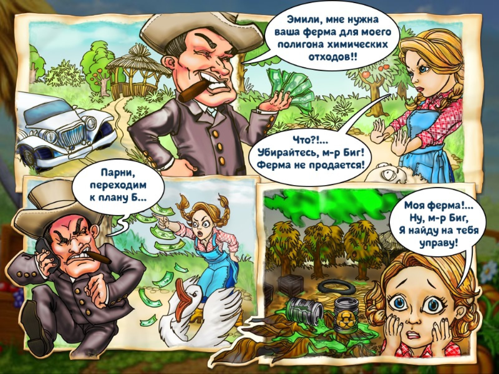 Помогите Эмили спасти свою ферму от попыток миллионера-толстосума превратить ее в свалку химических отходов. У вас совсем немого времени, чтобы помочь девушке поправить положение и создать райский уголок в небольших масштабах фермерского хозяйства. Займитесь выращиванием урожая, помогите ухаживать за животными, наладьте производство продуктов, чтобы улучшить ваше финансовое положение. Ваше умелое руководство приведет ферму к процветанию!